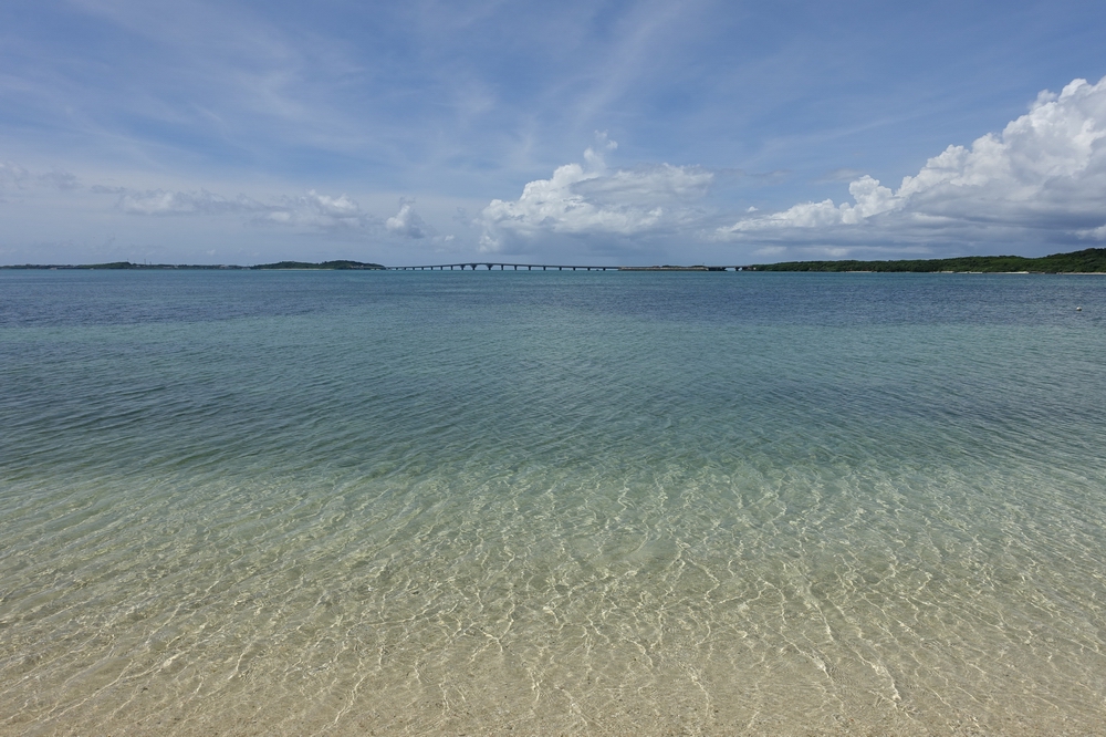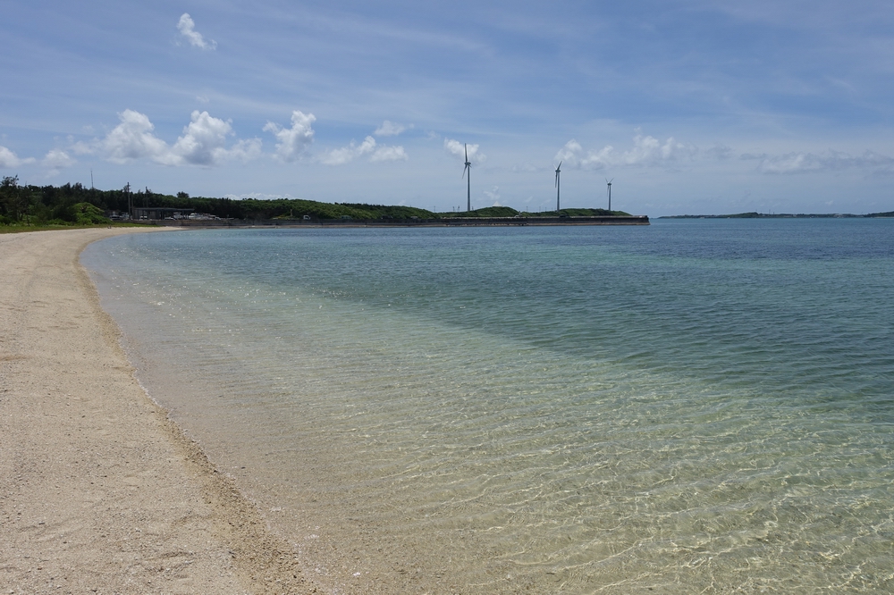 それでも、遠浅なのでやっぱり泳ぐという感じではなく、波打ち際で遊ぶ程度ですかね。基本はのんびり眺めるビーチかなと思います。西平安名崎の風車と池間大橋も遠くに見えるので、満ち潮で天気が良ければかなり良い景観だと思います。