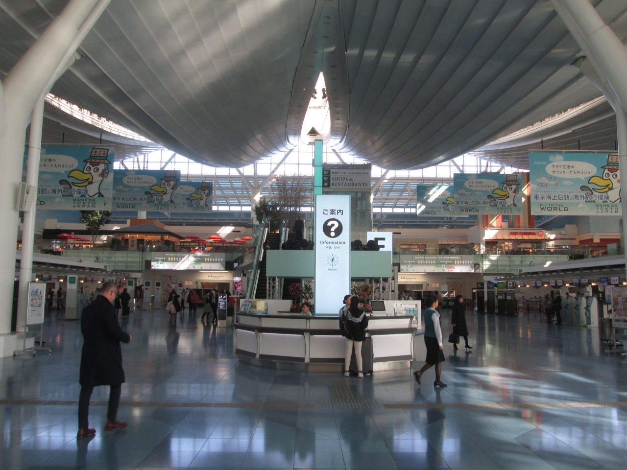 昼の羽田空港 国際線旅客ターミナルを利用しました。朝早い時間帯や夜遅い時間帯と比較すると出発階は空いていました。特に、出国前に両替をするときは行列ができていますが、利用したこの日は待ち時間なしで両替をすることができました。