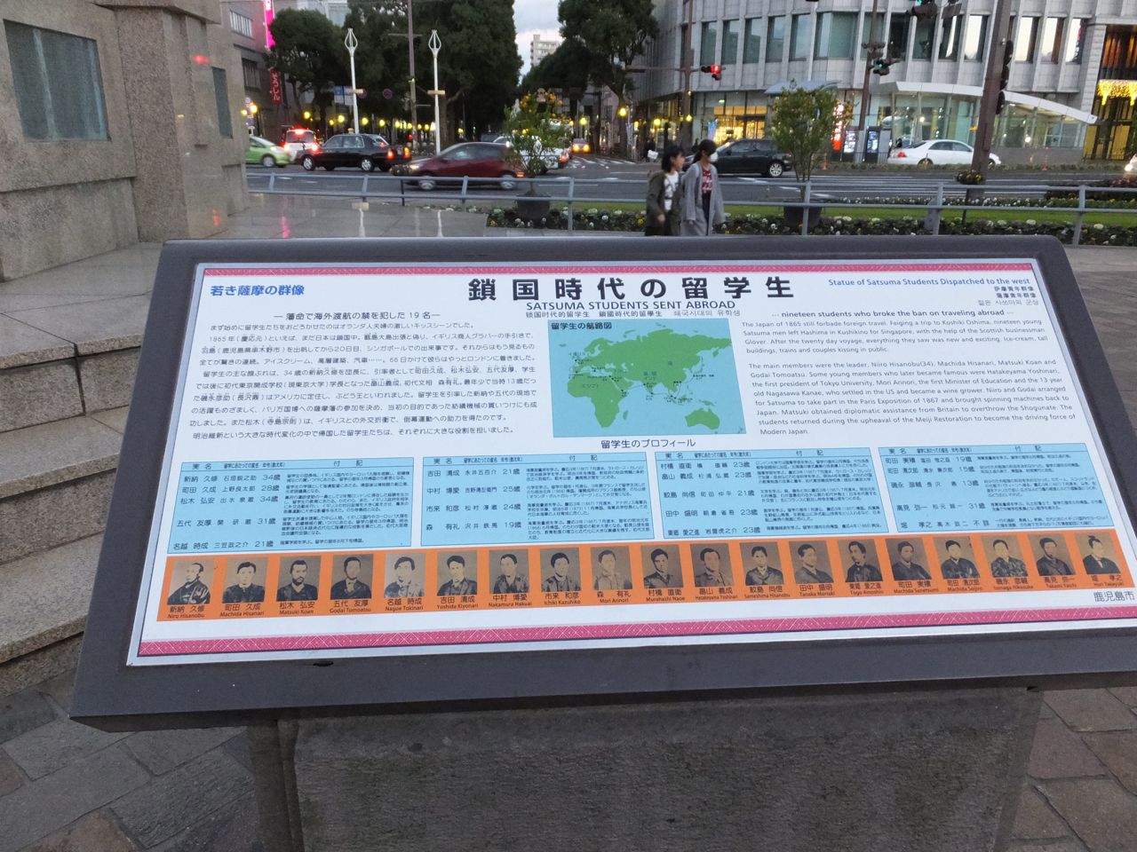 薩摩の幕末にイギリスに派遣された留学生たちの群像です。一番最初に観光客が降りたつ鹿児島中央駅前の一番目立つところに、西郷さんや大久保さんではなく、このような無名の(失礼!)人々の群像、とは意表をつかれます。学生だけでなく使節も混じっているのでけっこうなお年の方もいたりして楽しいです。一番若い人は13歳です。 ぐるっと一周して顔を見比べてみると楽しいです。