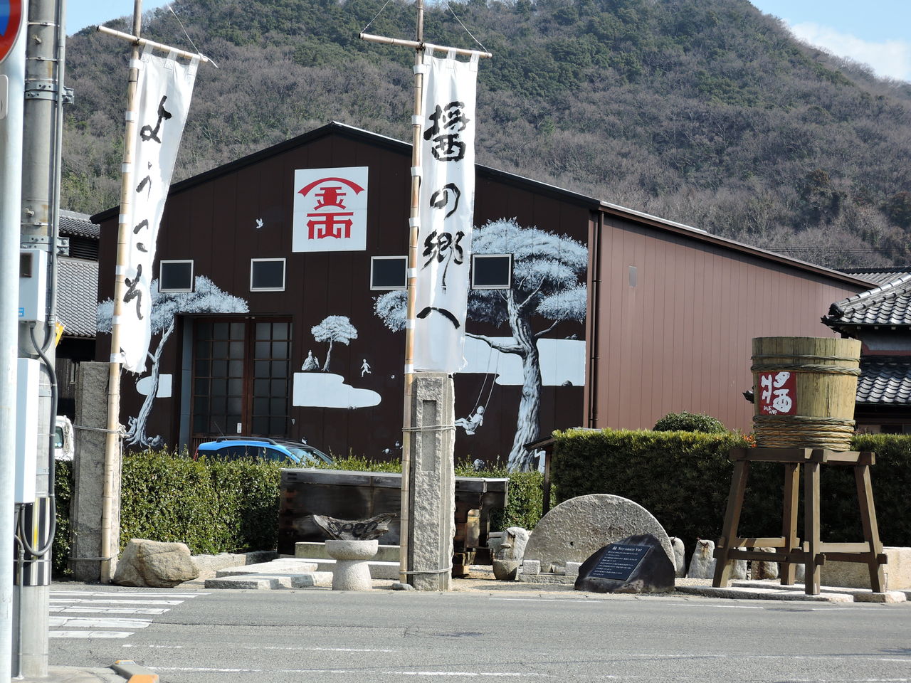 「醤の郷へようこそ」の幟が目印です。茶色の板塀に白の松の絵が目を惹く、金両醤油があります。