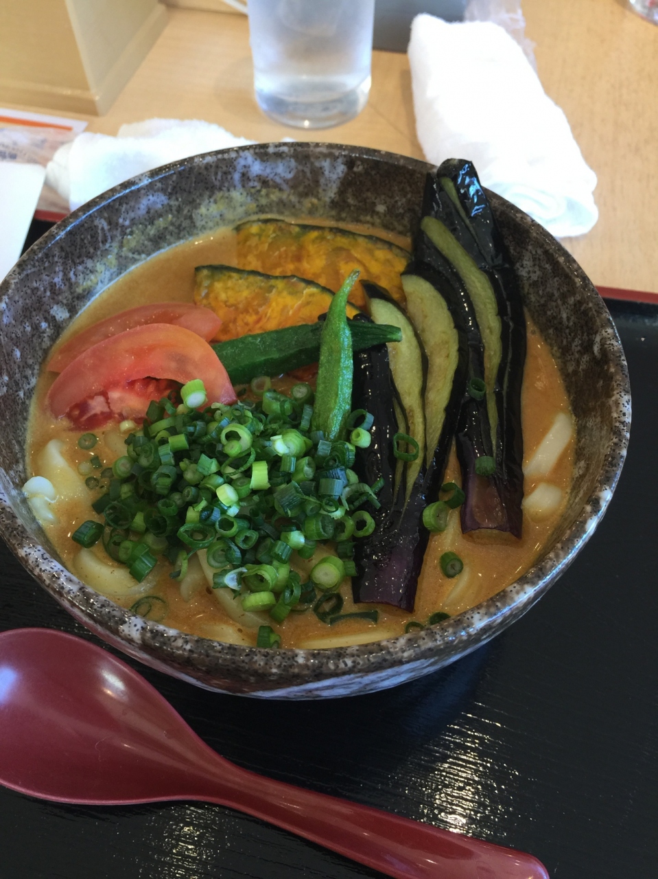 カレーうどんが人気のお店のようです。野菜カレーうどんを注文。辛さとスープが選べます。濃厚と和ダシ。濃厚のチョイ辛を頼みました。クリーミーなスープが太めの麺によく絡みます。ただ、麺が少々粉っぽく、スープの味が途中で飽きてきます。