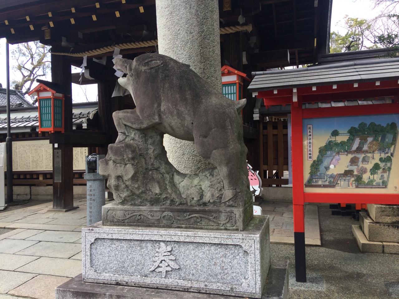 狛イヌならぬ、狛イノシシがお出迎えしてくれる護王神社。