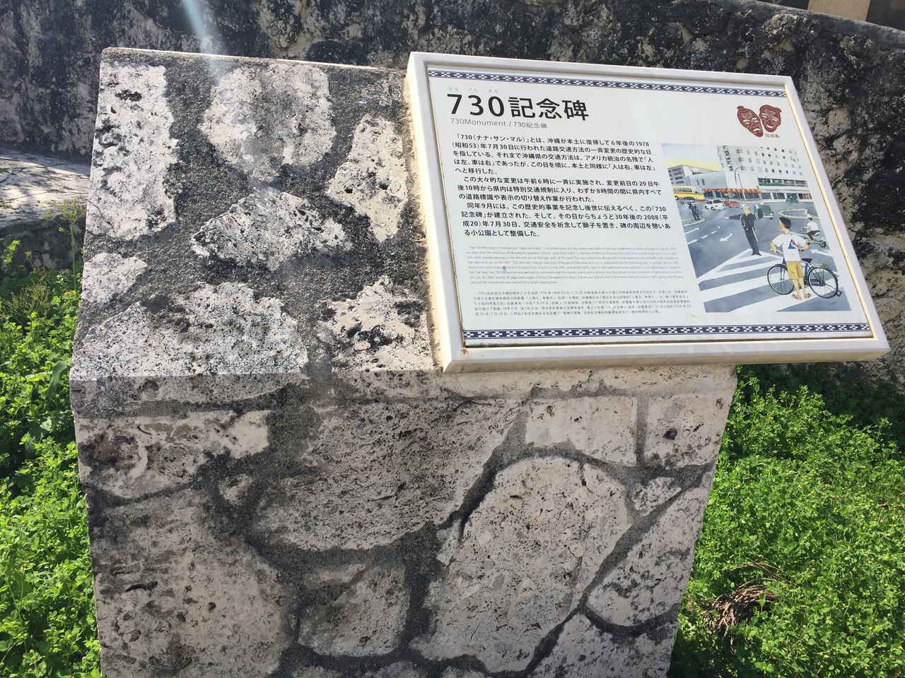 離島ターミナルから歩いて4、5分。中心部の交差点が、なぜか730交差点と呼ばれ、記念碑なんかも建てられている。付近のコンビニも730交差点前店となっている。なんでも車が左側通行に切り替わったのが7月30日ということだそうだが、わざわざ名付ける意味がイマイチよくわからん。ま、それだけの交差点。