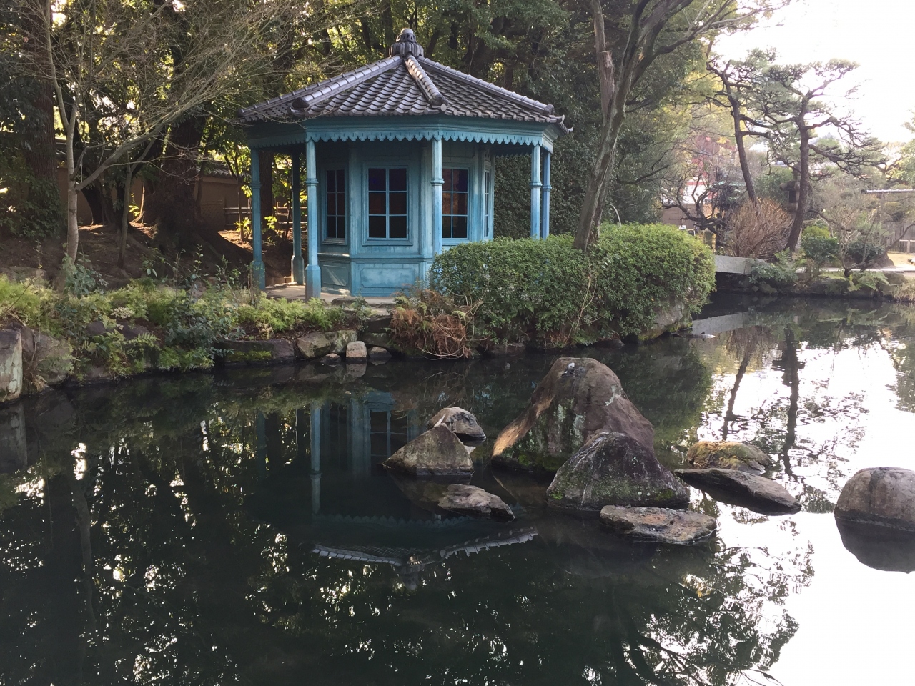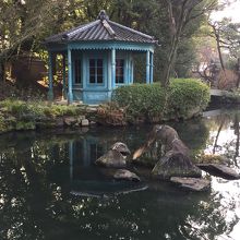 滝が流れ落ち池が配された優雅な日本庭園の中の順路をめぐっていくと、驚くような明るいブルーの東屋が出現。