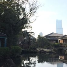 日本庭園、ブルーの洋風な東屋、そして向こうにあべのハルカスとなんともいえない不思議な光景でした。