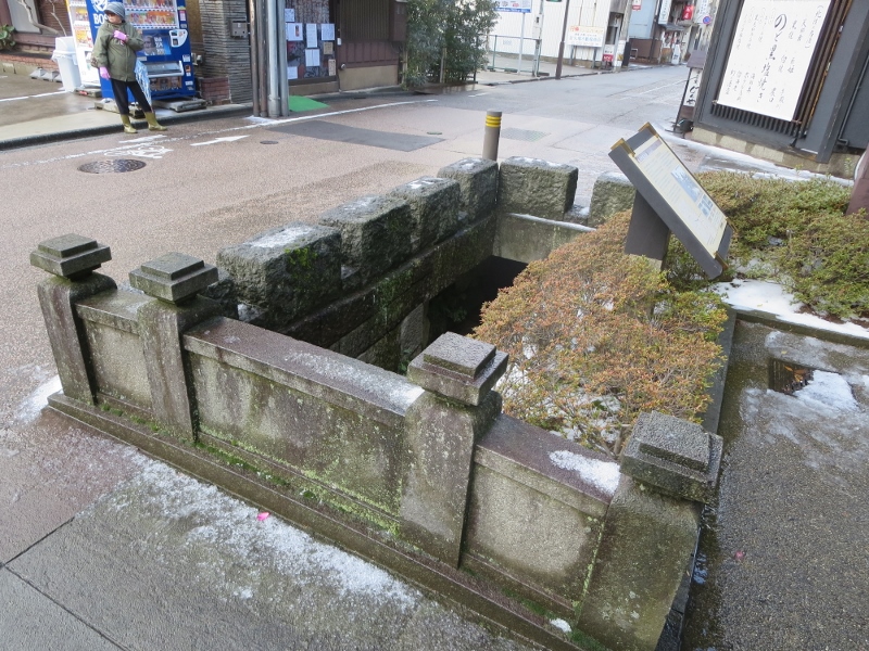 尾山神社の神門への階段の下、神社に向かって左側にありました。2代藩主前田利長が金沢城下の防御のために高山右近に造らせた西内惣構堀の跡を見ることができました。説明版があるので、細かいことを知ることができました。計画的に整備された金沢の町を知ることができました。