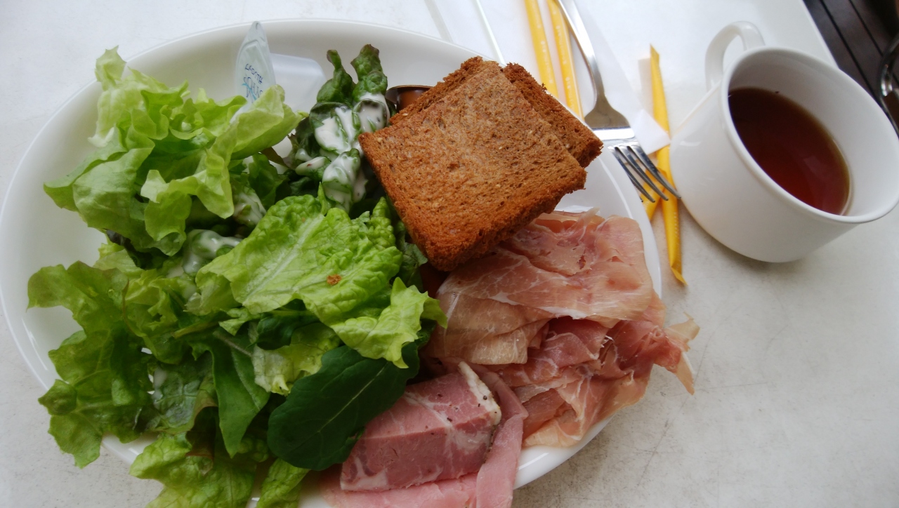 モーニングビュッフェは品川駅の駅構内のエキュートの中で楽しめます。飲み物ついて620 円。受付で先払いです。自家製の生ハムや厚切りのハムやベーコンなど加工のお肉を楽しめます。サラダもおいてあります。パンは薄切りの黒パンのようなものが1種類。飲み物は珈琲や紅茶、アイスもあり、薄いけどジュースもあります。あとスープと炊飯器もありました。ブッフェの場所は狭いです。生ハムは結構塩気がありました。あとソーセージはチョリソ的な感じの辛いものもありました。厚いハムはコショウがけっこう聞いています。大人向けのブッフェという感じです。外の席は喫煙席なので、朝から吸っている人がおおくて、テラス気持ちよいですが、吸う人の隣だとけむいかも。