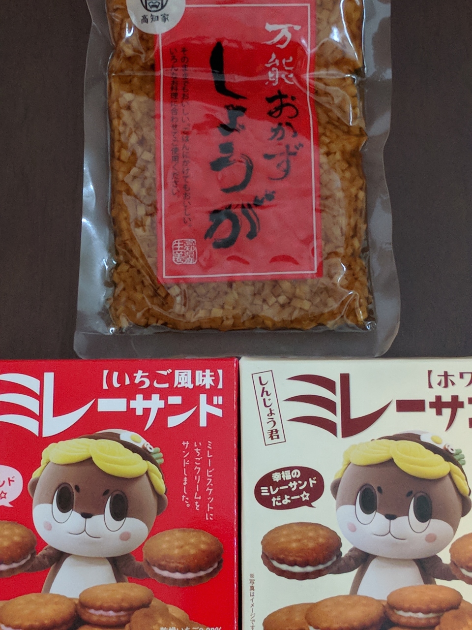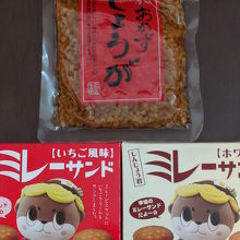 『宗田節のおかき』や『柚子マーマレード』と、ちびっこのおやつに『ミレーサンド』などお土産にしました。