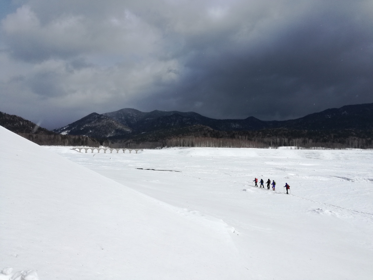 タウシュベツ橋梁の見学ツアーに参加し、スノーシューを履いて雪の中見に行きました。