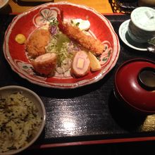 レディース御膳はエビフライ、ヒレカツ、チキンカツチーズ巻き、茶碗蒸しにデザートもつきます。