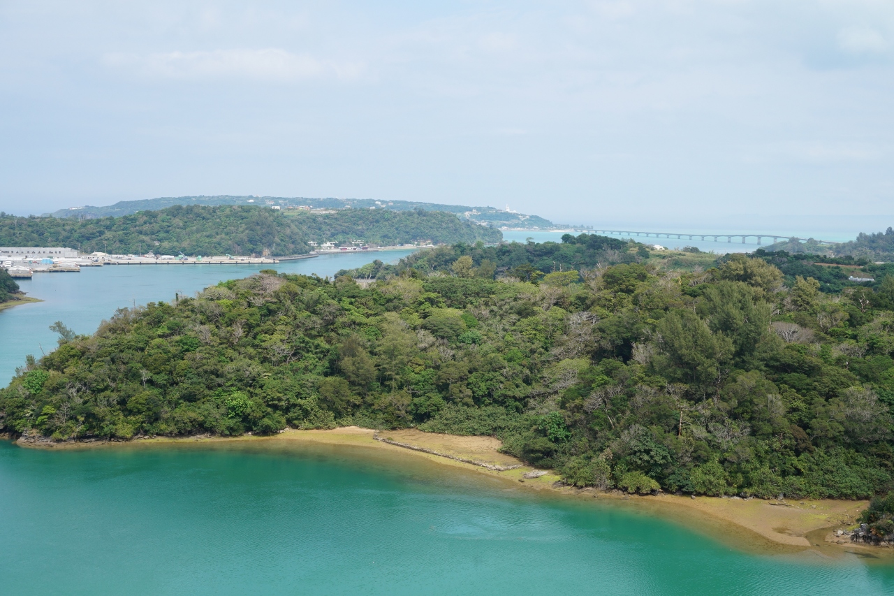 2010年に開通した屋我地島と本部半島との間のワルミ海峡に架かる橋です。橋の上からはワルミ海峡、ヤンバルの景色、遠くには古宇利大橋、古宇利タワーまでが一望できます。ワルミ海峡は前日の雨の影響か緑色でした。