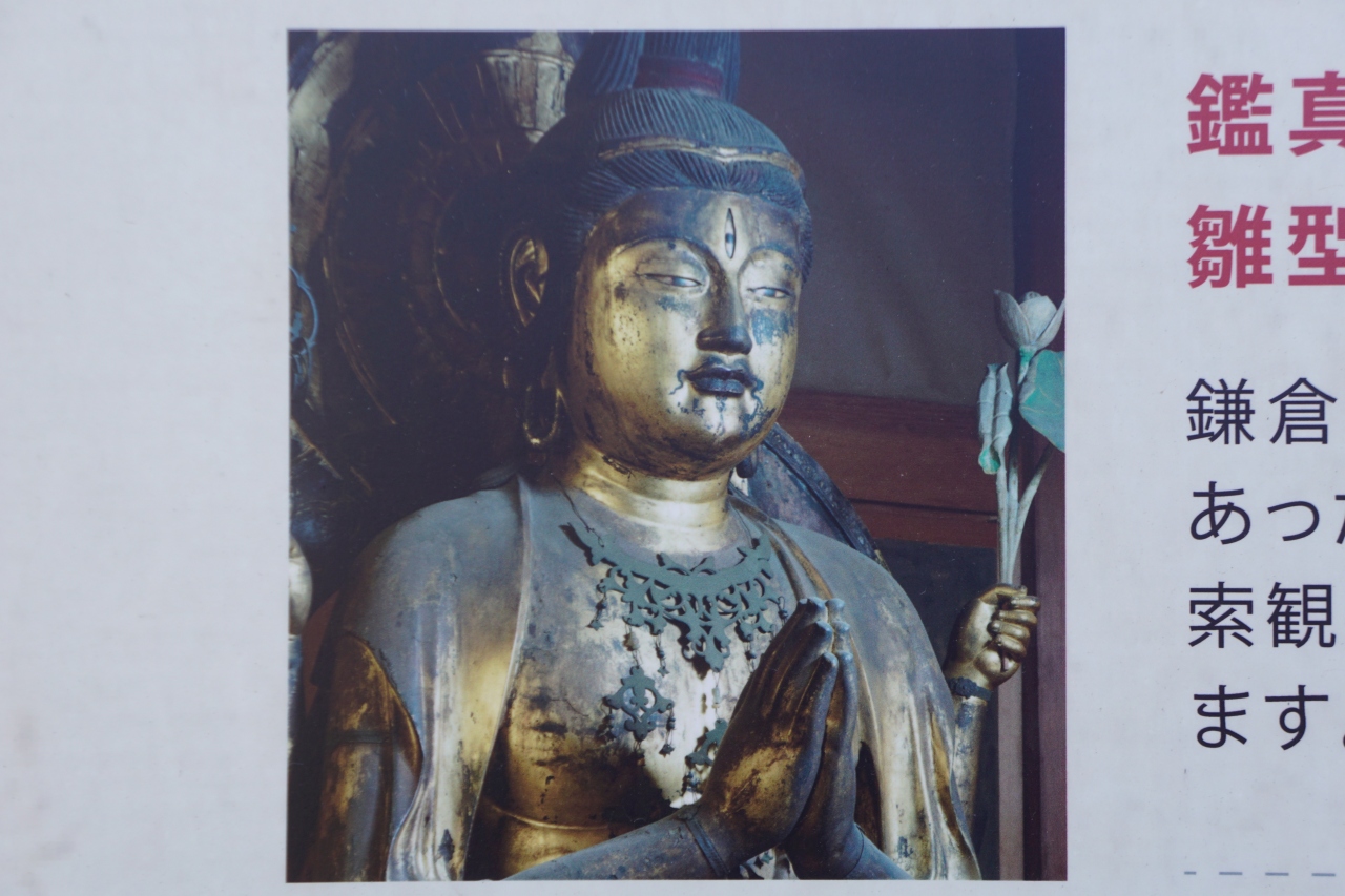 不空院は、木造不空羂索観音座像が寺宝。ダメモトで拝観を申し込んでみましたが、予約してないとダメということでした。ただ、特別開帳の時期があるようで、そこで拝見するのが基本でしょう。山門前にその金色の座像の写真があって、二つの目の間にもう一つ縦に割れた目がある。ちょっとありがたそうなお顔でした。