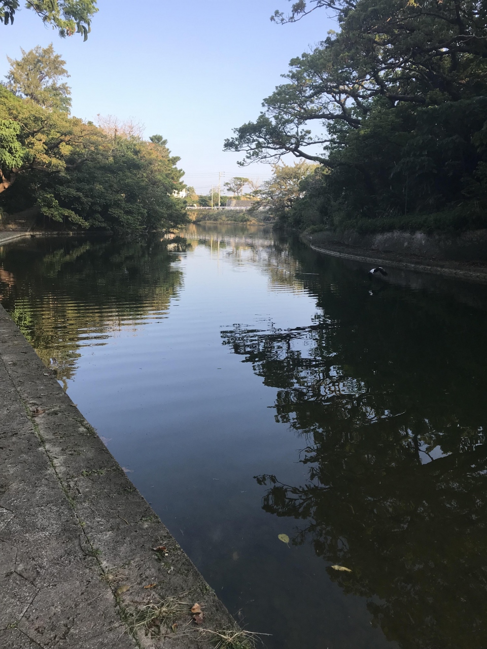弁財天堂を左手に奥に進むと、別の池があります。階段を下りて池の側を歩いてみました。これが今まで見つけられなかった、龍潭でした。たまに鳥が着水して驚きます。朝日が差し込み人は私以外いないので静かです。池の周り道をずっと先まで歩いていきましたが抜けられそうになかったので、結局同じ道を戻りました。