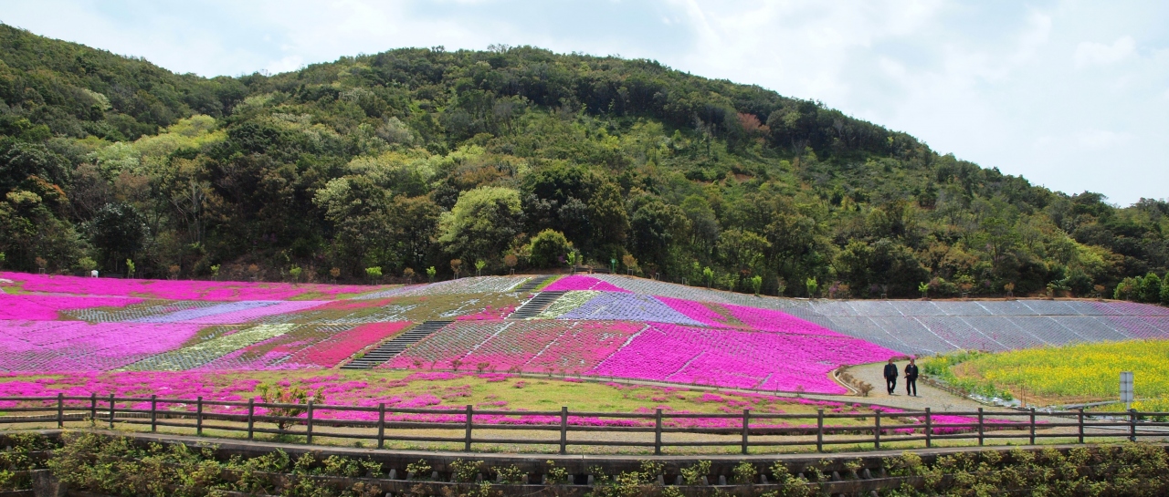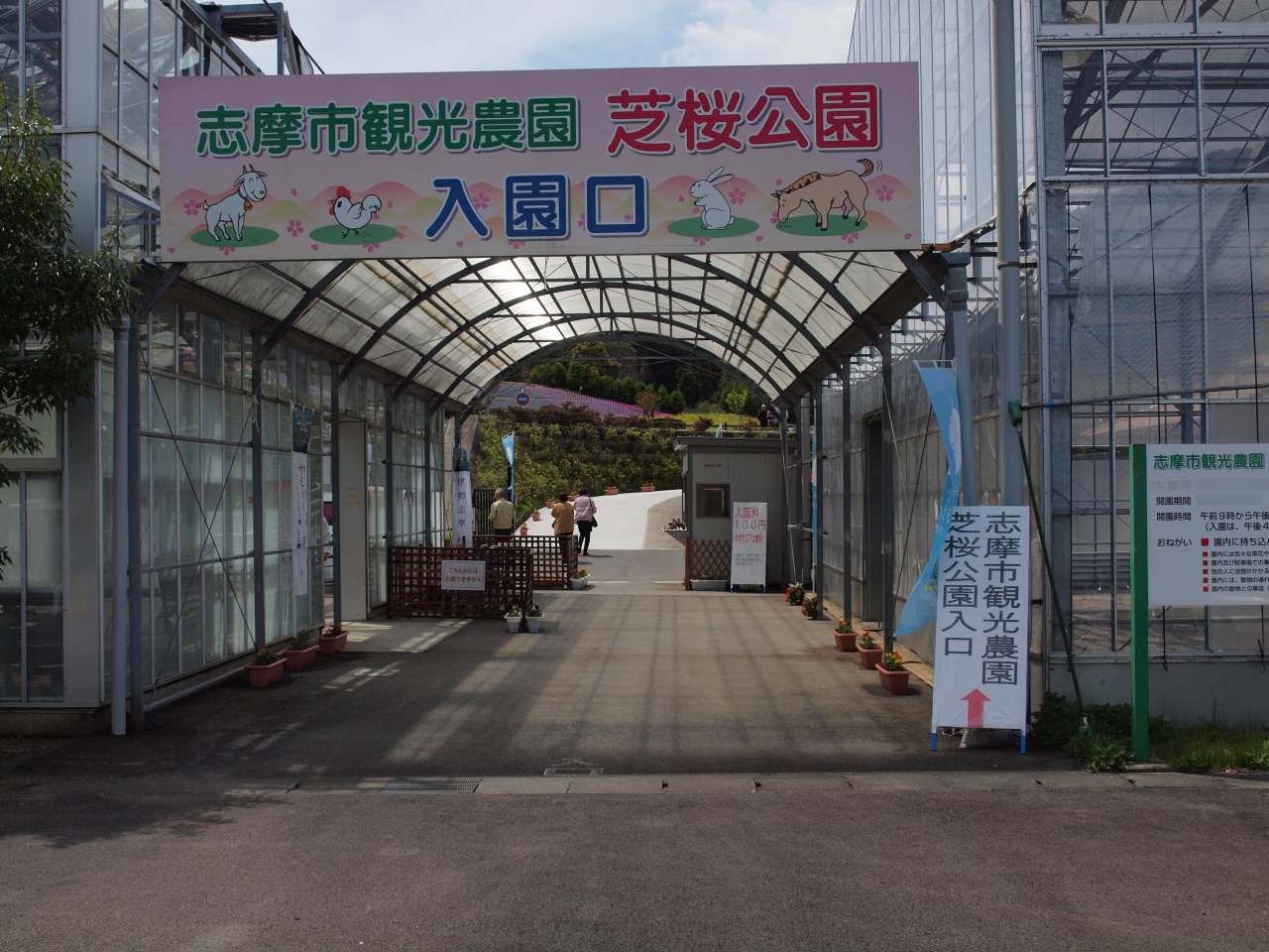 売店の人から、すぐ近くに芝桜公園があるという情報を得て、さっそく行ってみると「志摩市観光農園芝桜公園」と書いてありました。入園料 100円