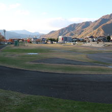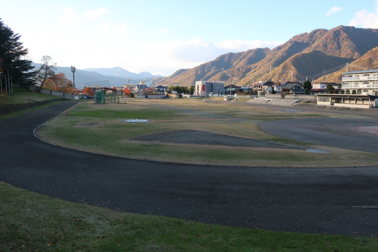 上田城の二の丸の北側に陸上競技場があります。こちらも野球場と同じく上田城の堀跡に作られた施設で、如何に上田城の堀が大きかったかが分かる場所ではありますが、特段観光地と言った感じではなく、400mトラックがあるだけです。あえて見所を探すなら競技場に下りる坂の右側の残る土橋の石垣から、堀に水を通す石樋が残っているのが見られる位です。
