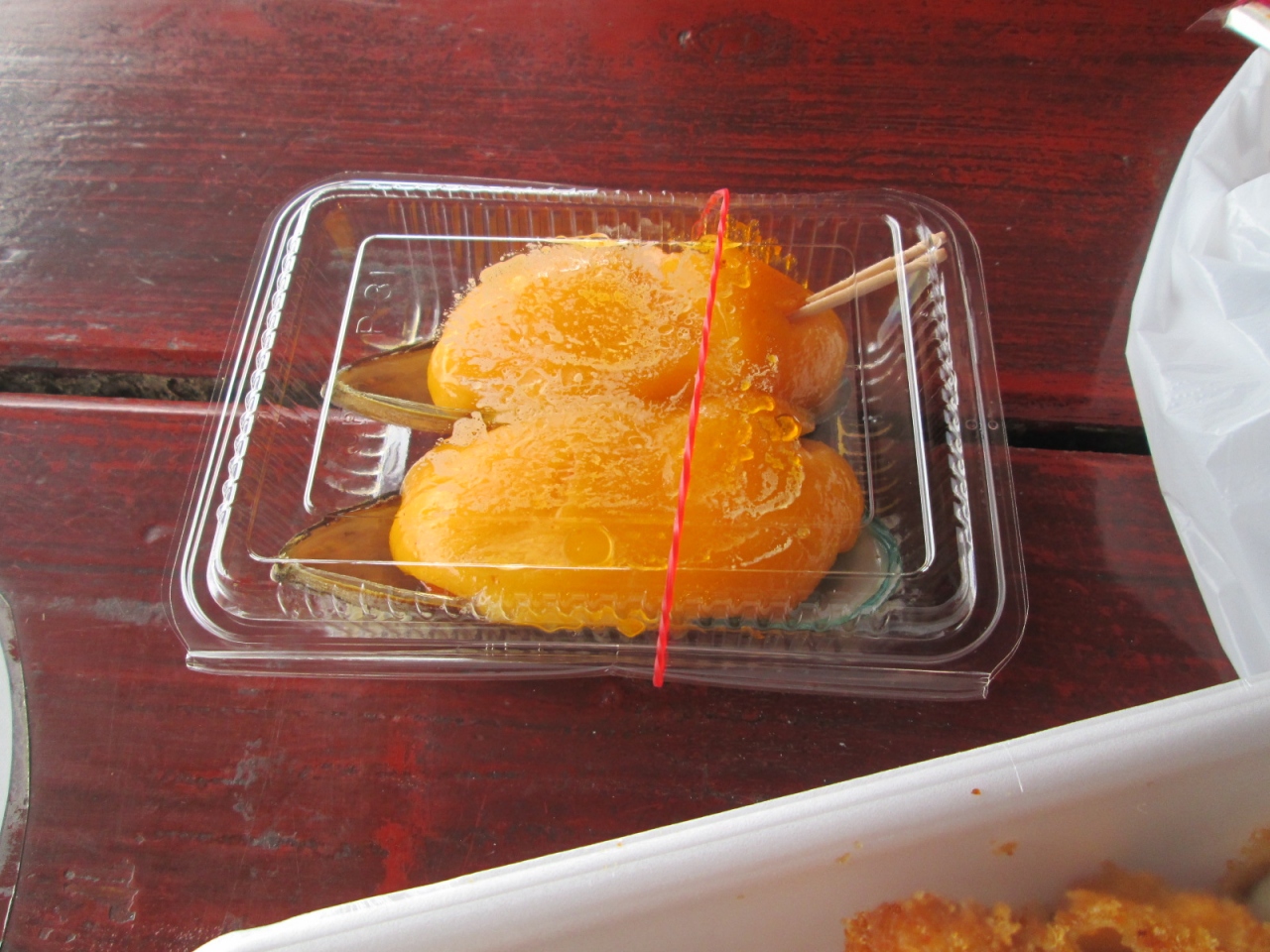 ここの恩納村水産物直売所で「ムール貝うにソース」1個120円と「マグロカツ」1パック200円が気にかかり、購入して食べてみました。茹でたムール貝にのせられたうにソースが濃厚で、とても美味しかったです。