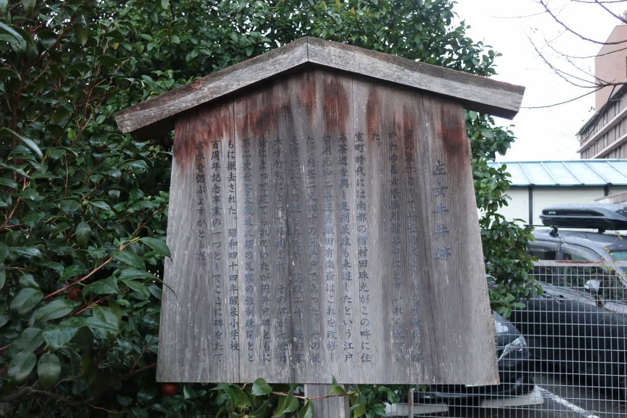 西本願寺から堀川通りを上がった東急ホテルの近くに左女牛井之跡の石碑が立てられています。平安時代より京の名水として知られた井戸の一つであることで知られた井戸です。そして、この地にはかつて源氏堀川館があり、左女牛井の水が館に引かれていました。義経、静御前もこの井戸の水を飲んでいたのでしょう。また室町時代には茶人 村田珠光も愛用した井です。