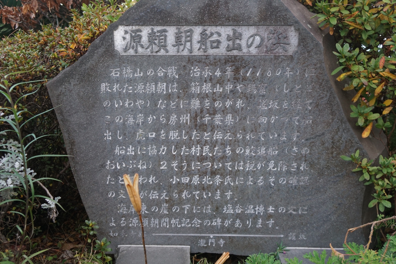 海水浴場で賑わう時期もあるようですが、その時期じゃなくても大きな料理旅館があったりして、ちょっと雰囲気があるような気がします。また、近くには石橋山合戦に敗れた源頼朝がここから安房へと船出したという石碑もありました。