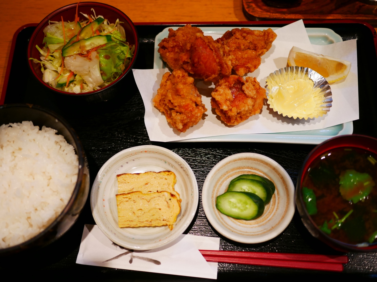 実は、「こくりこ」で鶏重を頂こうと思っていたのですが、日替わりメニューをチェックしにくると、”唐揚げ”の文字が・・・吸い込まれるように店内へ。
