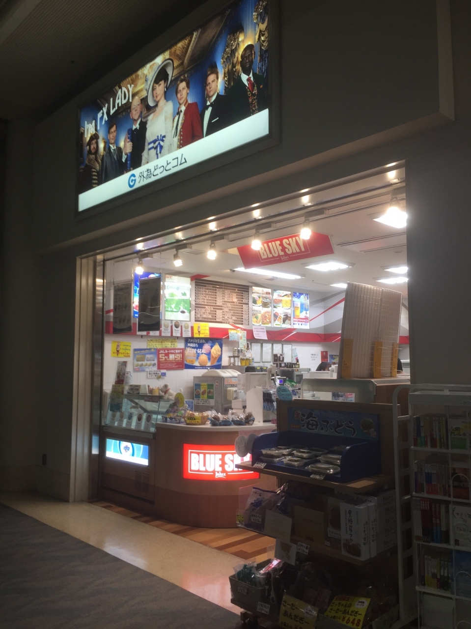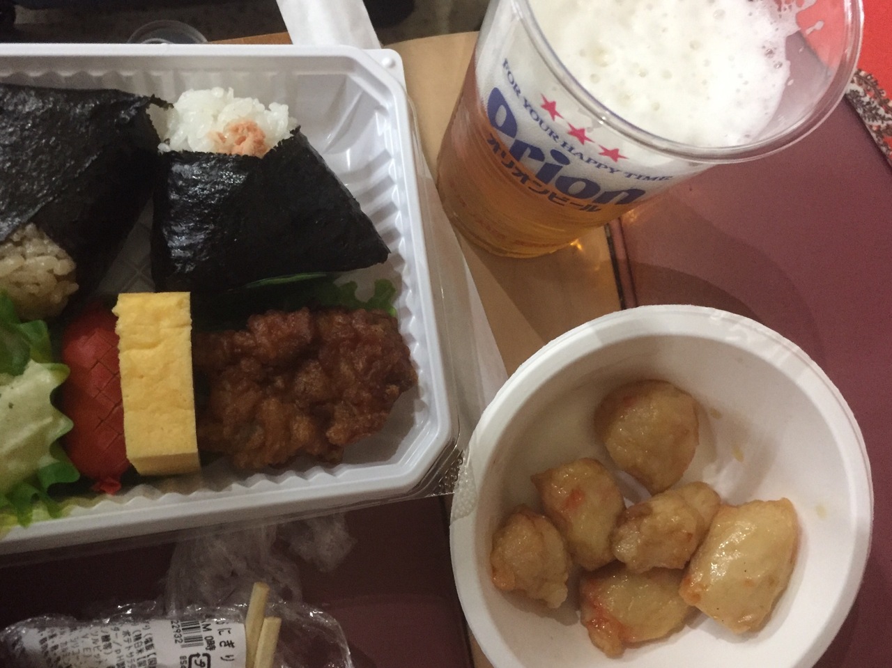 宮古空港から乗り換えで那覇空港に来ました。丁度夕方だったので、食事を取ろうとレストランを探しましたが、ゲート内にはないとのこと。仕方なくブルースカイでおにぎりとビールを買い、夕食としました。食べるものがもう少し充実していると助かりますが。