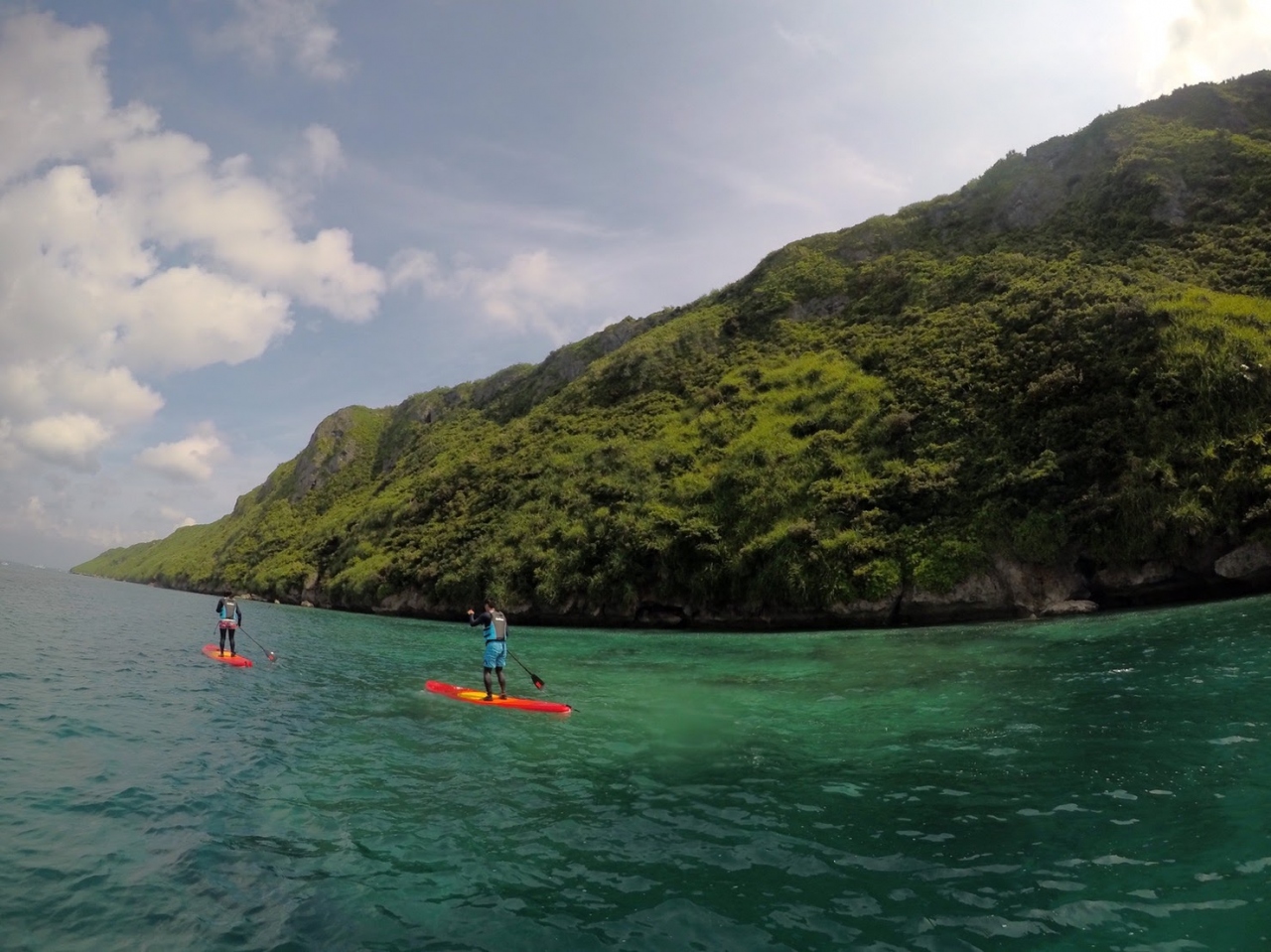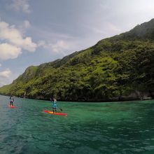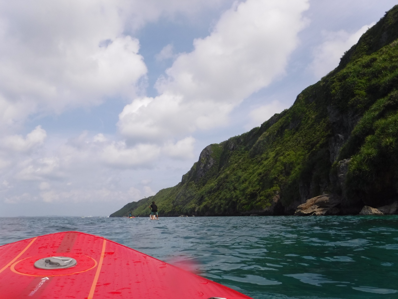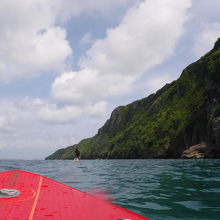 迫力ある島の断崖絶壁を見上げながらのSUPはとても面白いです。