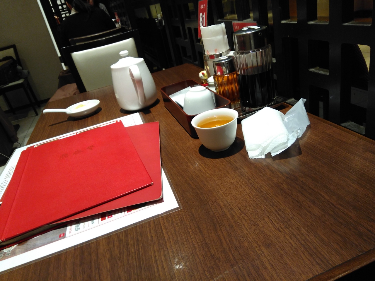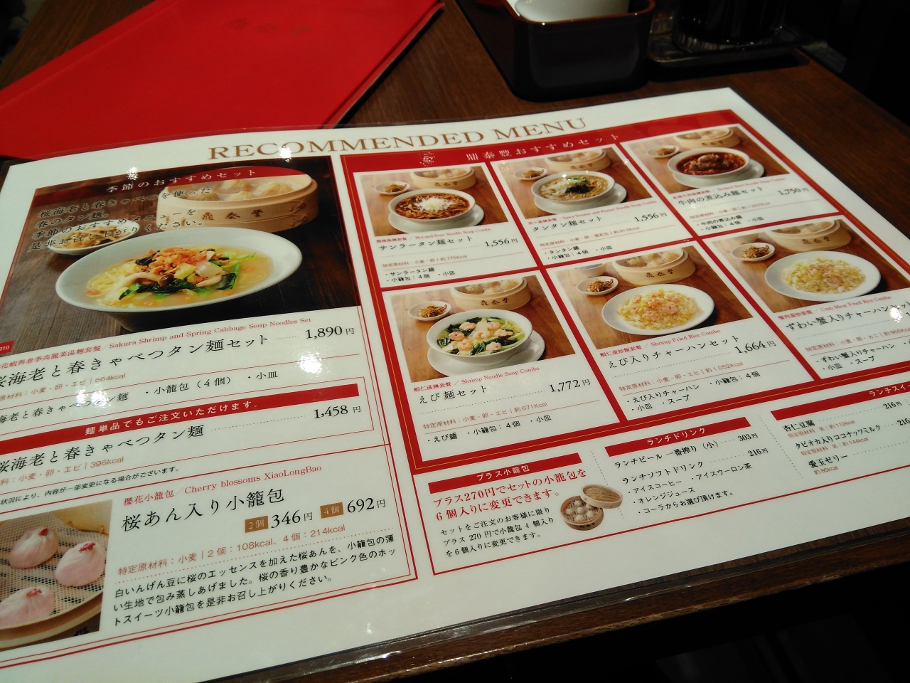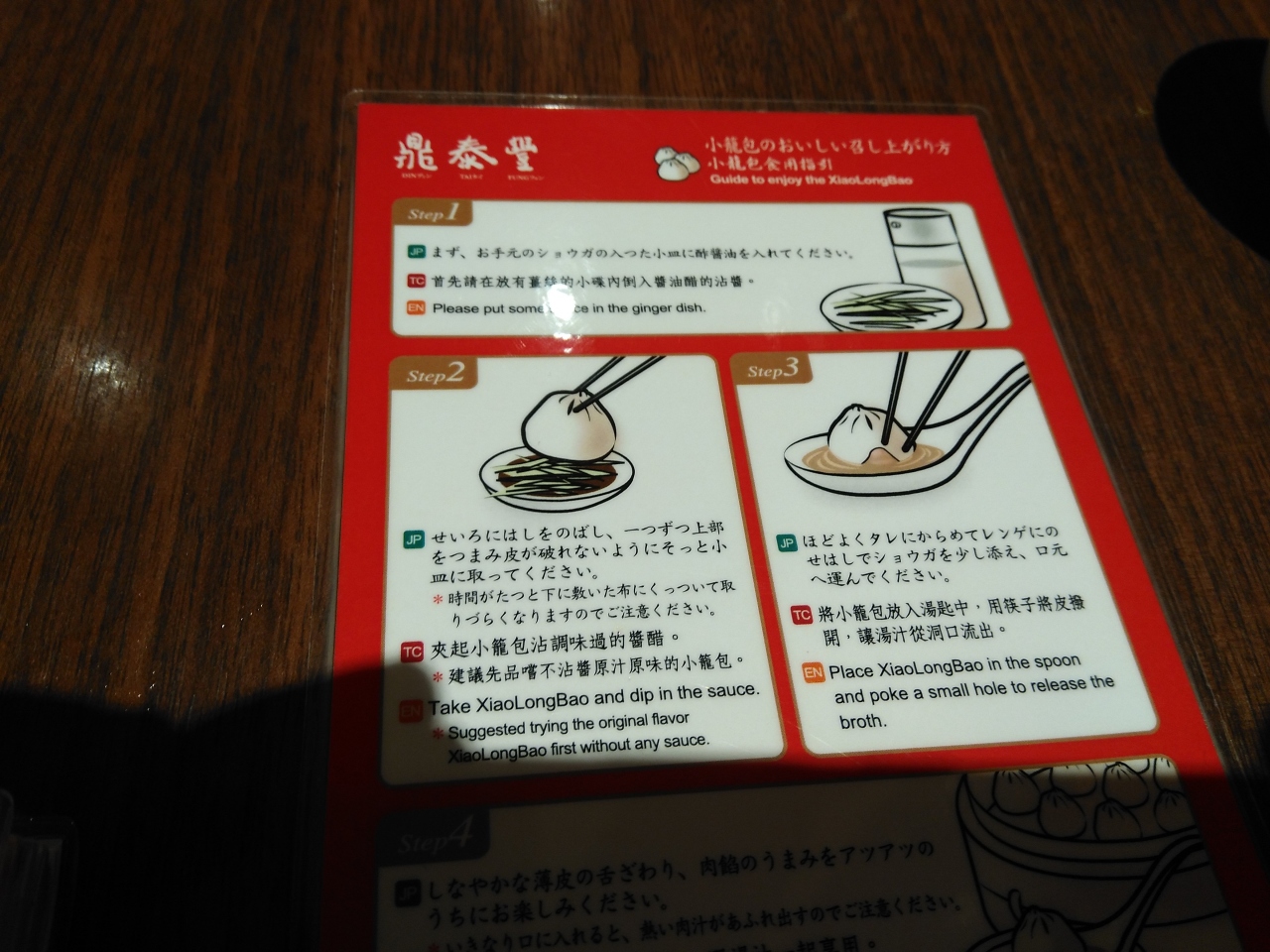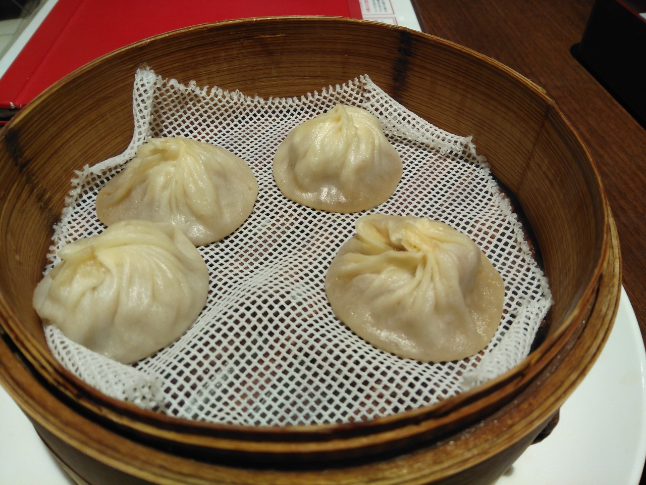 夜は高くてなかなかいけないですが平日のランチは1500円位で楽しめます。セットは麺やチャーハンなどに4つ入り小龍包が付いています。今日は酸辣湯のセットを注文しました。まず小龍包が出てきました。食べ方の説明が書いた札があります。