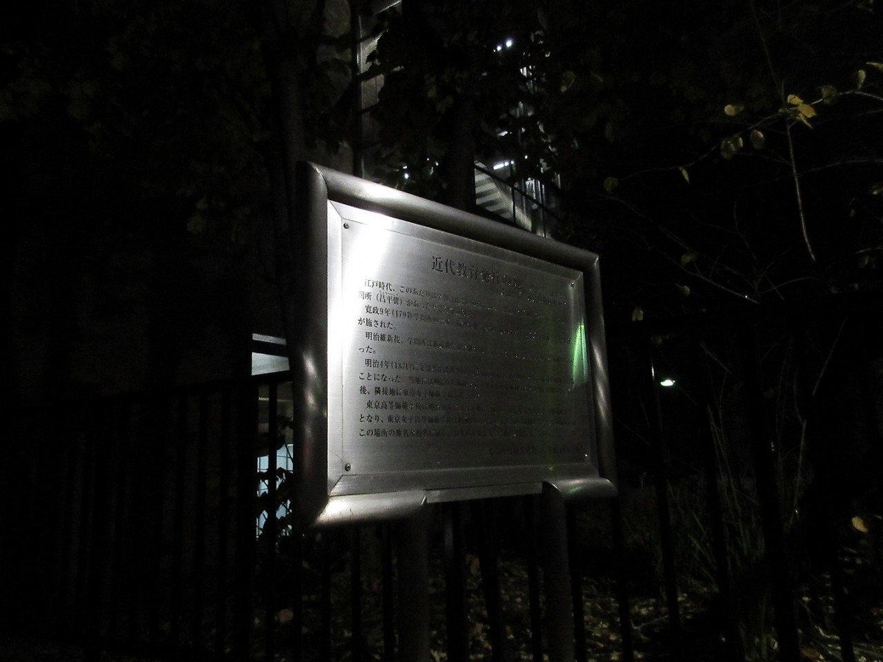 神田から御茶の水駅界隈を散策し、聖橋を渡った先、丁度東京医科歯科大学のすぐそばの植え込みに隠れるように金属製の案内板が立っていました。江戸時代に武士の子弟が学ぶ昌平坂学問所がこの界隈にあり、。明治になり大学校への発展していったという歴史が書かれていました。東京には他にも九段坂に蕃所調書が大学へと発展していったことを記す案内板もありますし、複数の細い流れが集まり大きな近代教育の大河となったのだということを知りました。
