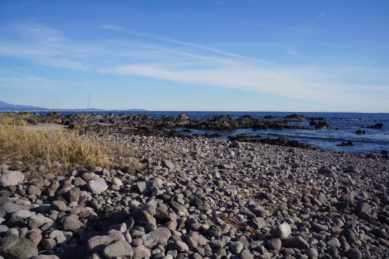相模湾がどこといっても真鶴半島から三浦半島までとあまりにも広いので、漠としてしまいますが、これは真鶴半島の突端から眺めた相模湾。この辺りは、沖合2~3kmで、水深はもう100m。いきなり深くなる地形だけに生物の多様性があるのだとか。貝類博物館でそんな知識を得て眺めると風景もちょっと違って見えてくるような気がしました。