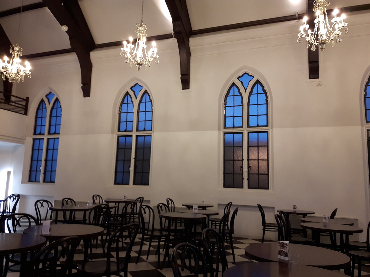 新幹線新神戸駅から、少し三ノ宮方面へ下ったところ、昔の教会をそのままリノベートしたカフェ&ショップです。床は白と焦げ茶のモダンな市松模様。曲線のデザインが柔らかい木のテーブルと椅子に良くマッチしています。鉄枠の高窓はかつてステンドグラスがはまっていたことを想像させるクラシックな形で、結婚式に招かれたような、温かく平和な気を感じます。ランチも夜も、サンドイッチやスープ、コーヒー、ケーキが頂けます。サンドイッチは、添えられたピクルスやツナサラダも自家製のマヨネーズのせいかとても美味しい。少しトーストしたパンとフィリングが良くあい、飾らない手作り感が良いです。