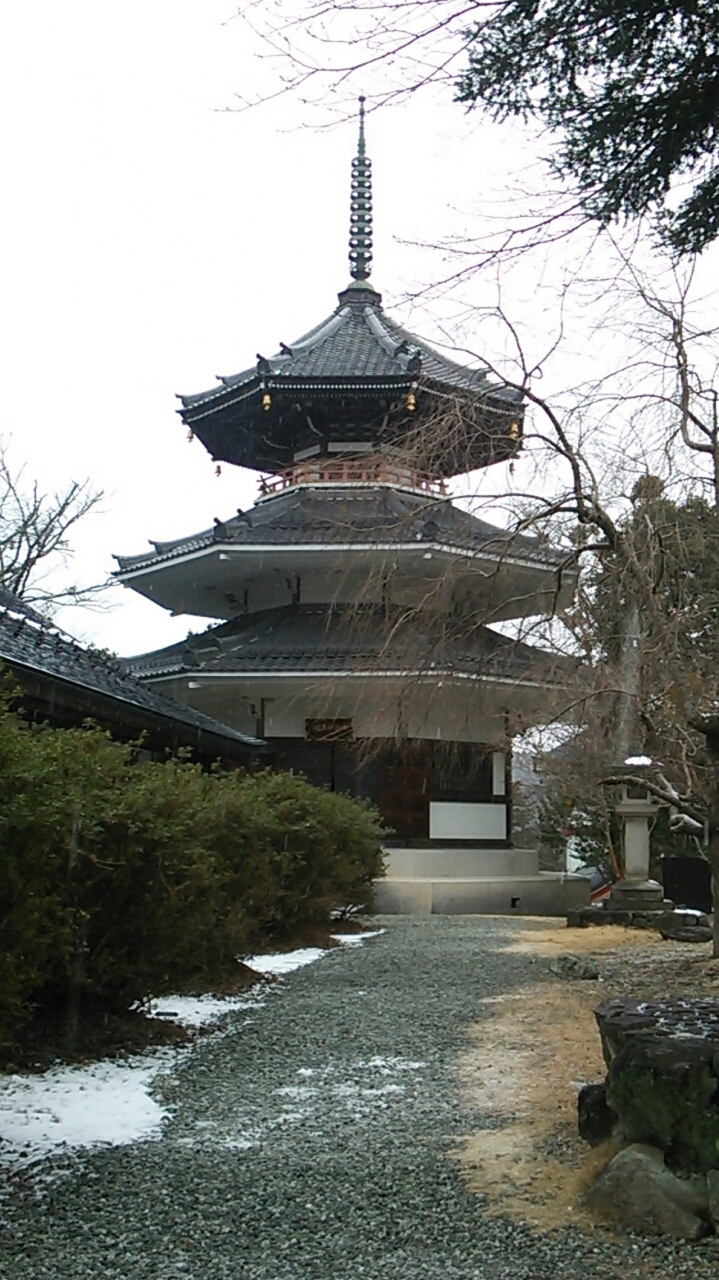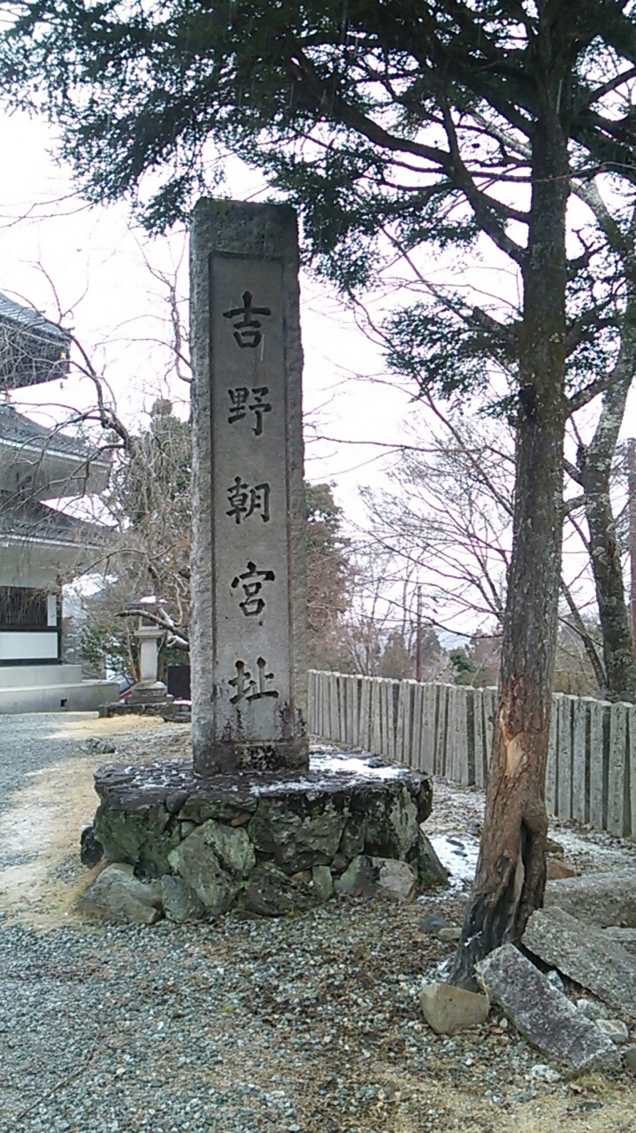 金峯山寺の境内から見える三重の塔らしき建築物がその吉野朝宮跡で、2018年1月28日現在、「南朝妙法殿」として利用されていました。しかし当日、その吉野朝宮跡へ向かったところ、金峯山寺の境内から階段を下りた辺りに「この辺りが吉野朝宮跡」の旨の案内掲示があり、当初はその辺りが吉野朝宮跡と思ってしまいました。しかし念の為、その三重の塔らしき建築物を見ようと向かったところ、この建築物が 吉野朝宮跡だと分かり、案内掲示に騙されました。