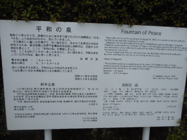 長崎市内にある平和記念公園のエスカレーターを上がったあたり、平和祈念像までの間の広場にある、とても立派な噴水です。長崎に原爆が落とされたときに、被ばくされた人たちが水を求めたそうで、その魂のためにこの泉があると書いてありました。石碑もあって悲しい気分になります。