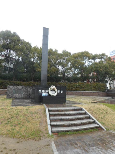長崎の平和記念公園というと、平和祈念像があるところを想像しますが、こちらはその下にある公園で、原爆の爆心地になります。今は一見普通の公園ですが、その奥には黒い大きな碑が建っています。まさにここが爆心です。横には浦上天主堂の遺構などもありました。観光客はいませんでした。