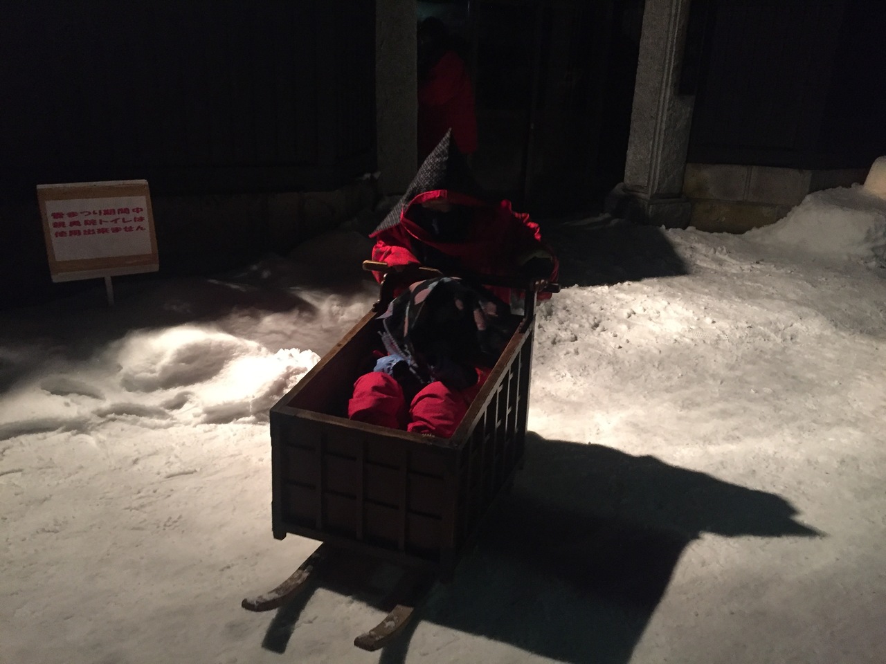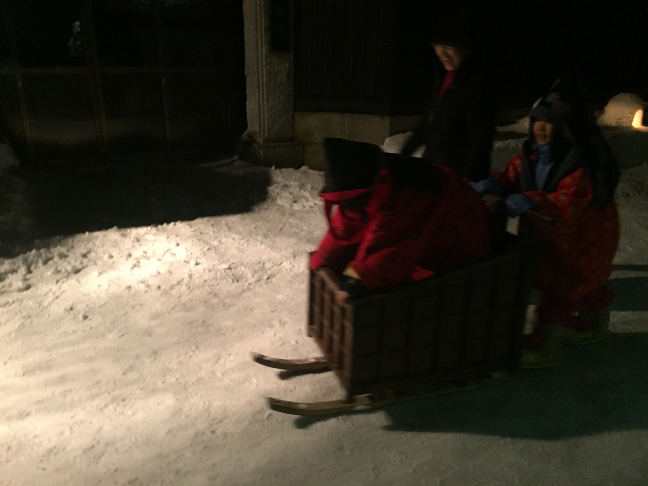小さな女の子が雪ん子衣装で昔のソリにも乗ってくれ カメラマンの人気だった。