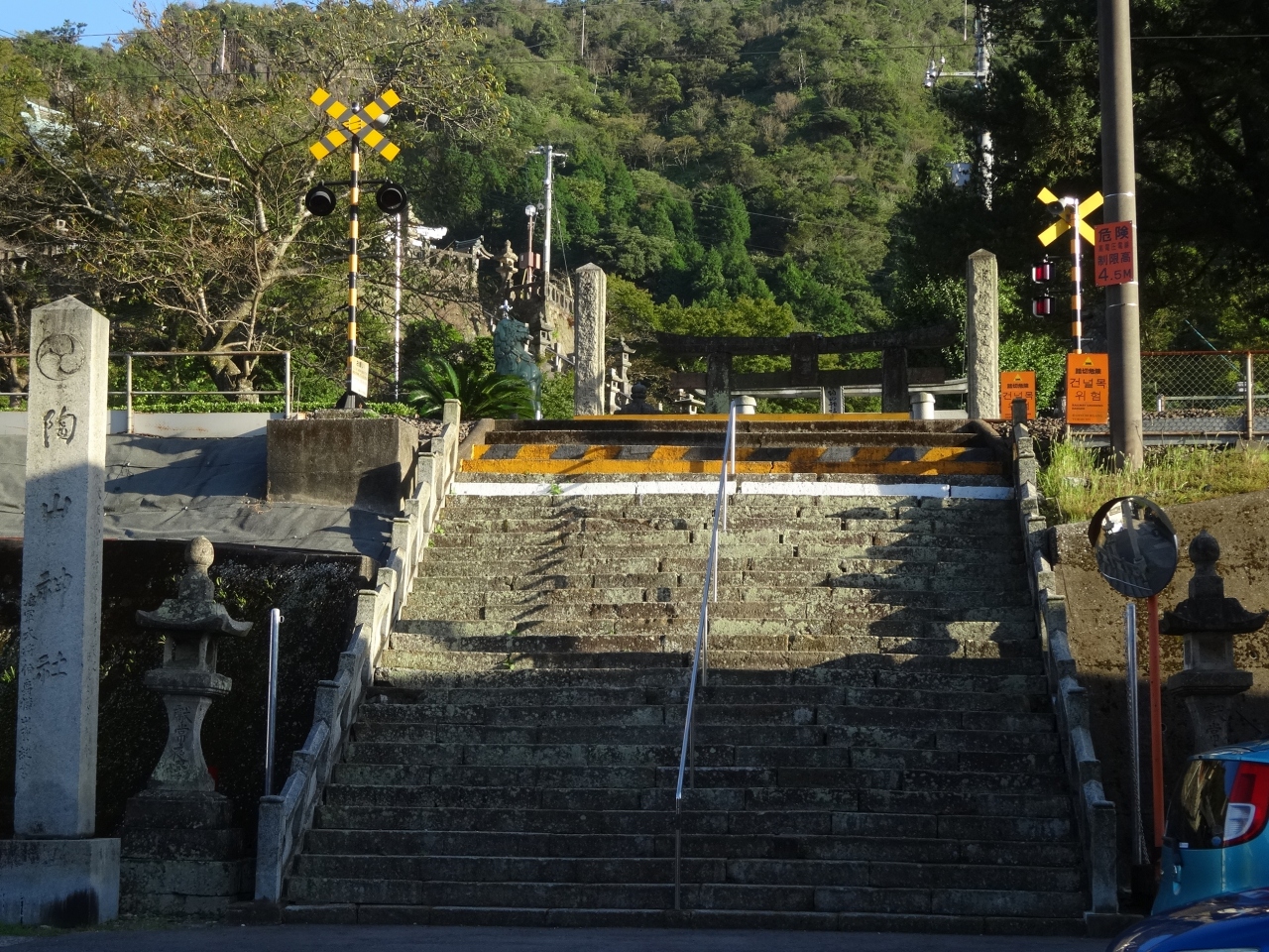 珍しい青磁の鳥居があります。境内に行くには線路を渡る必要がありますが、踏切はあるものの遮断機がないので十分注意してください。高台になっており、上有田の街並みが一望できました。ゆっくりできるスポットです。