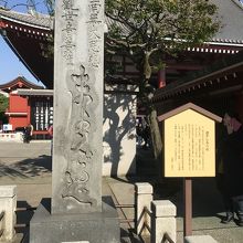 浅草寺の本堂のすぐ近くにある石碑です。本堂に続いている参道とは少しそれた場所にあるので、参道の人の流れにのっているとみつけにくいと思います。昔は迷子の情報を交換するためにこの石碑を利用していたのだそうです。