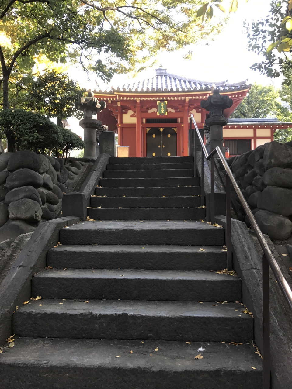 浅草寺の宝蔵門に向かって右のほうにある、木々がうっそうとしげった小高い丘の上にあり、少しわかりにくかったです。浅草寺は観光客で非常に混雑していましたが、この弁天堂付近にはほとんど人がおらず、ひっそりと静かでした。