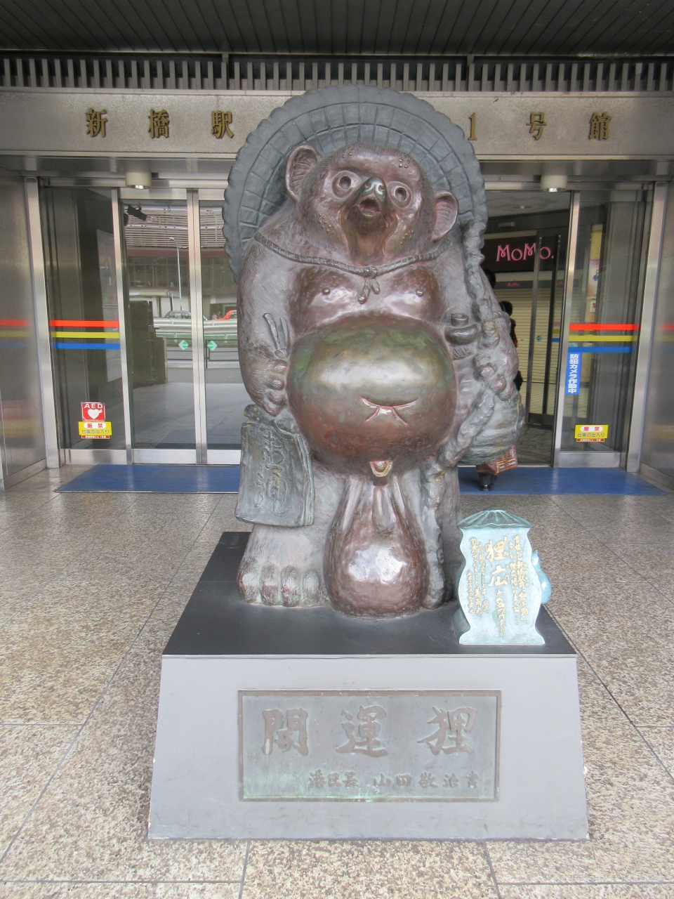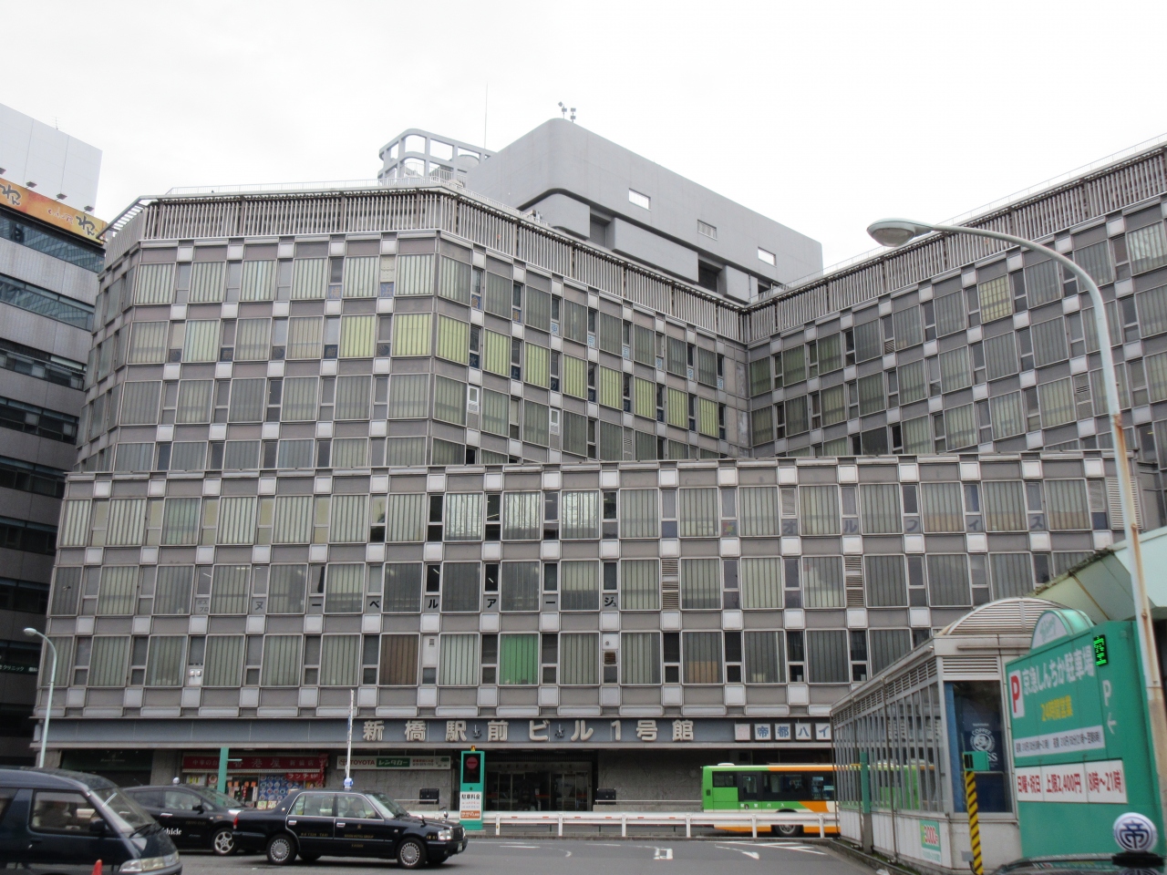 新橋駅汐留口前に建つ、地上9階建てのビルで、2棟のビルから成り立っています。格子状のガラスの外観が目を引きます。地下から2階にかけては多くの飲食店が入っていて、夜になると仕事を終えたサラリーマンが一杯飲みに馴染みの店に吸い込まれるように入って行きます。ボクシングジムもあり、仕事帰りに汗を流す人もいるのかもしれません。入口に飾られた開運狸の像は、昔、新橋駅前にあった狸小路の名残りとして飾られています。道行く人が狸のお腹を触って通り過ぎていくのが印象的でした。新橋駅をはさんで反対側に建つニュー新橋ビルと共に、シニアサラリーマンの憩いの建物と言えます。
