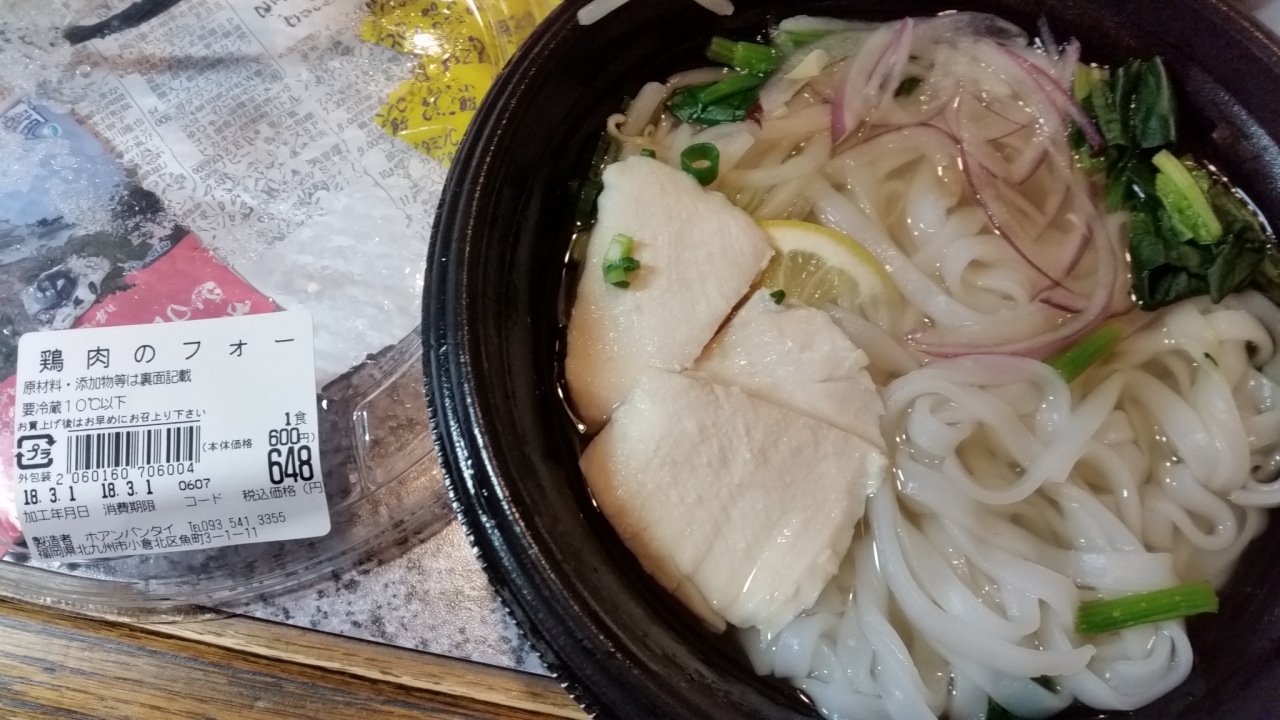夕方、魚町銀天街をぶらぶらしていたら「半額 300円」という声が聞こえ、寄って行きました。フォーが半額の300円。「スープは下に入っているから、500wで3分チンして」ということで、ホテルの電子レンジでチンしました。美味しく頂きました。