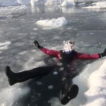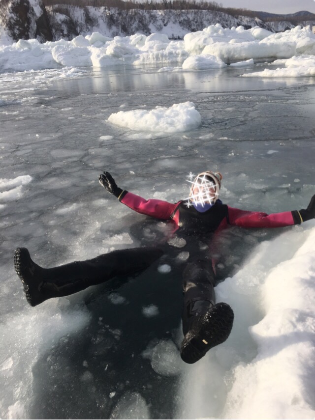 ウトロも沖合が海水ですが、まだまだ流氷があり、2月と違って割れ目も多いため流氷の海にあえて落っこちる体験が可能です!