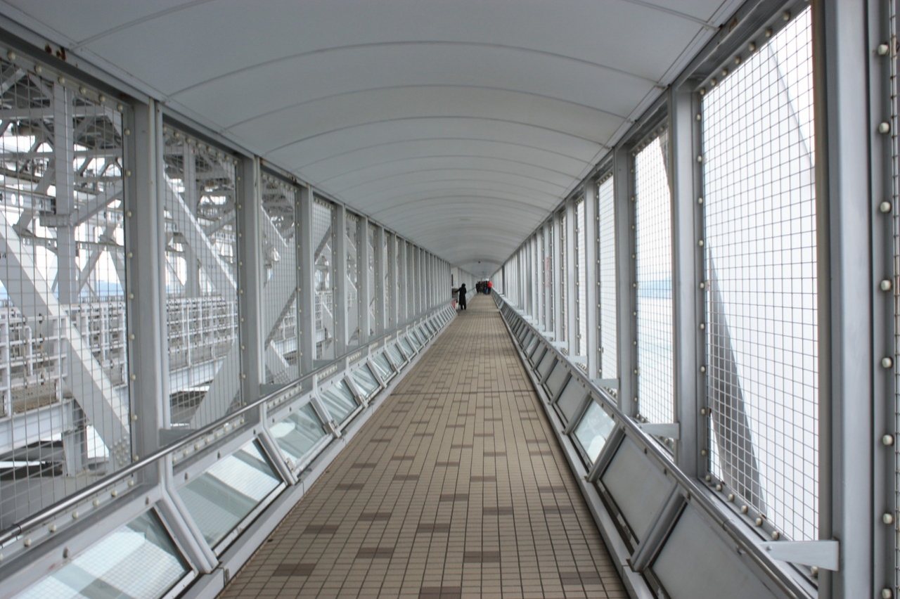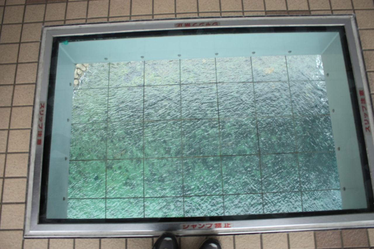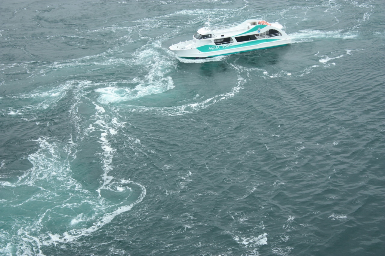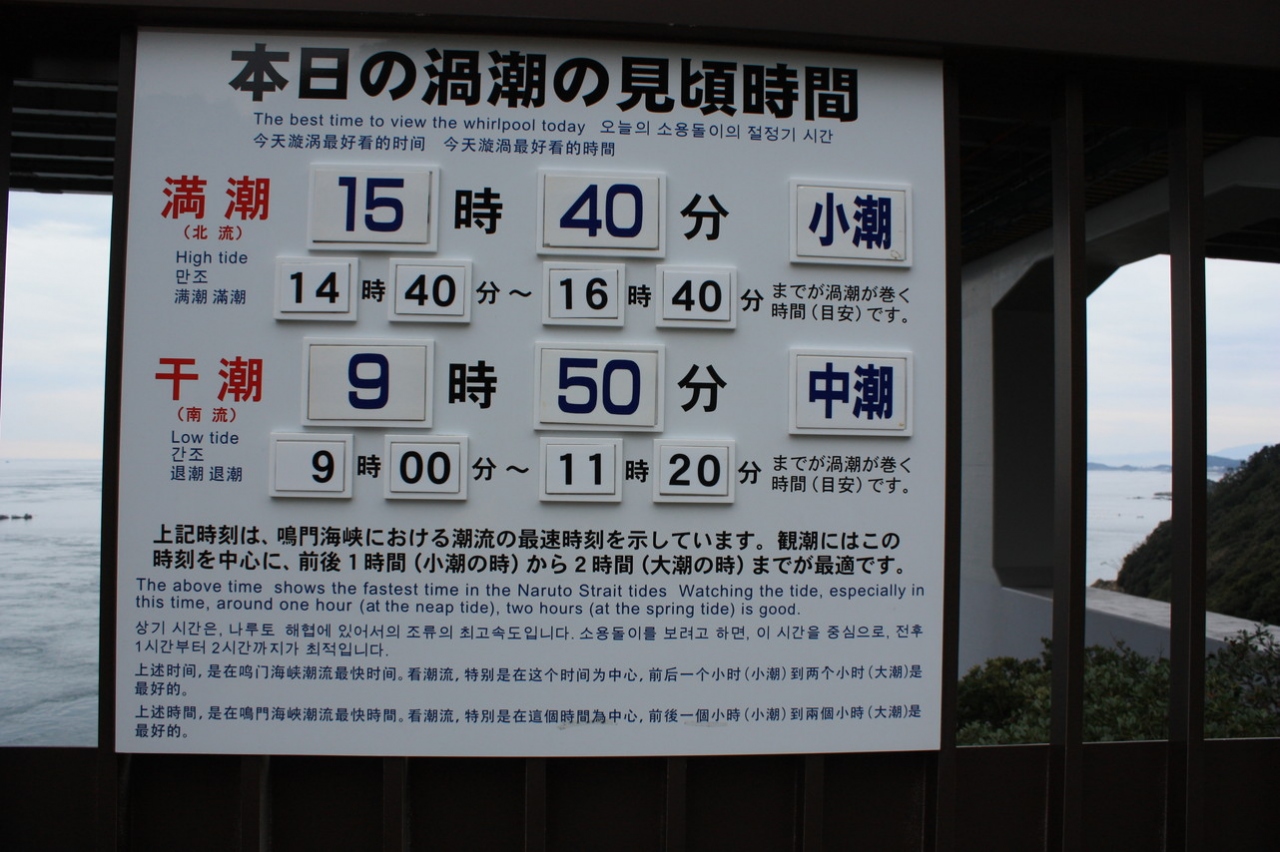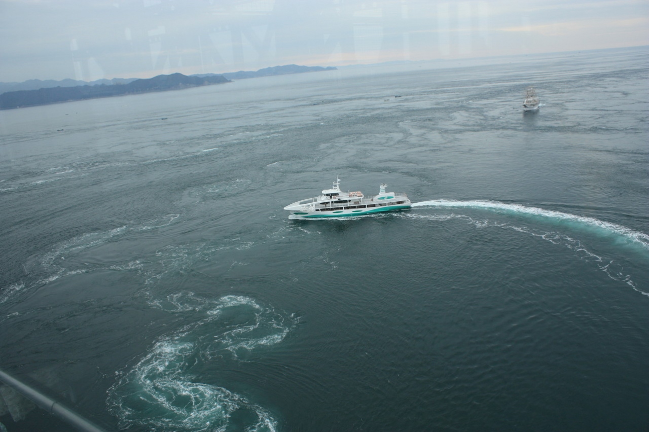 定番の渦の道へきました。先程の遊覧船から車で2分位の高台にあります。漁港には無料で車が置けたのですが此方は500円の有料駐車場しか有りません。駐車場から柚の渦の道までは起伏のある道を20分位ぷらぷらと歩く必要があります。渦の道の施設内はバリアフリーですが行くまでが一寸大変かもしてません。中には行ってしまえば、天気に左右されること無く鑑賞する事が出来ます。サイドの窓は まめに掃除をしていますが、床のガラスは流石に掃除できないですね。また、床のガラスの下に渦が出来る事は稀でしょうから・・渦の雰囲気写真は撮れますが、迫力を求めるには不向きかも知れません。