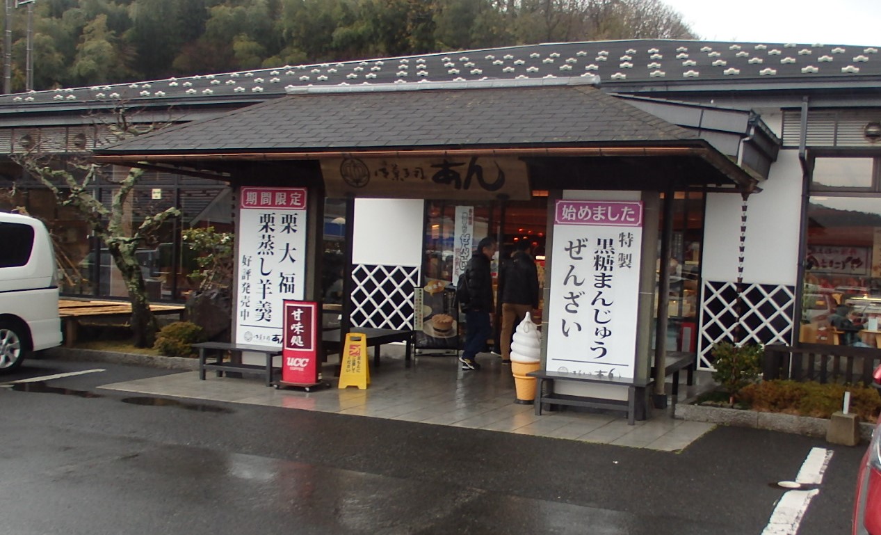 夕日が浦温泉郷の入り口あたりにある街道にいくつかのお土産店が共有している広い駐車場があり、その一つが「あん」でした。