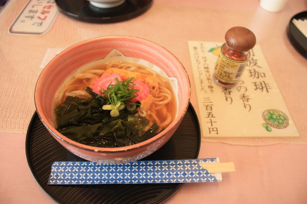 渦の道を右手に下っていくとすぐに土産物屋さんがあり、ここが千畳敷展望台になります。皆さん、渦の道など楽しんだ後なので、ここで写真をとっている人は少ない感じでした。もう少し天気が良いと撮影大会になるのでしょうか?近くの食堂に入りましたが、お客さんは居ませんでした。景色を見ながら鳴門うどんを頂きました。うす味でしたが、とても美味しかったです。