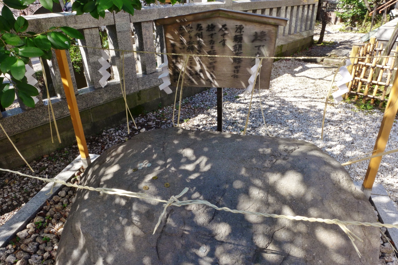社殿に向かって左手前に注連縄が張り巡らされた大きな石がありました。どう見ても牛には見えませんがこれが「牛石」、この石を撫でると願い事が叶うそうで別名を「撫石」、源頼朝とも縁があるそうです。