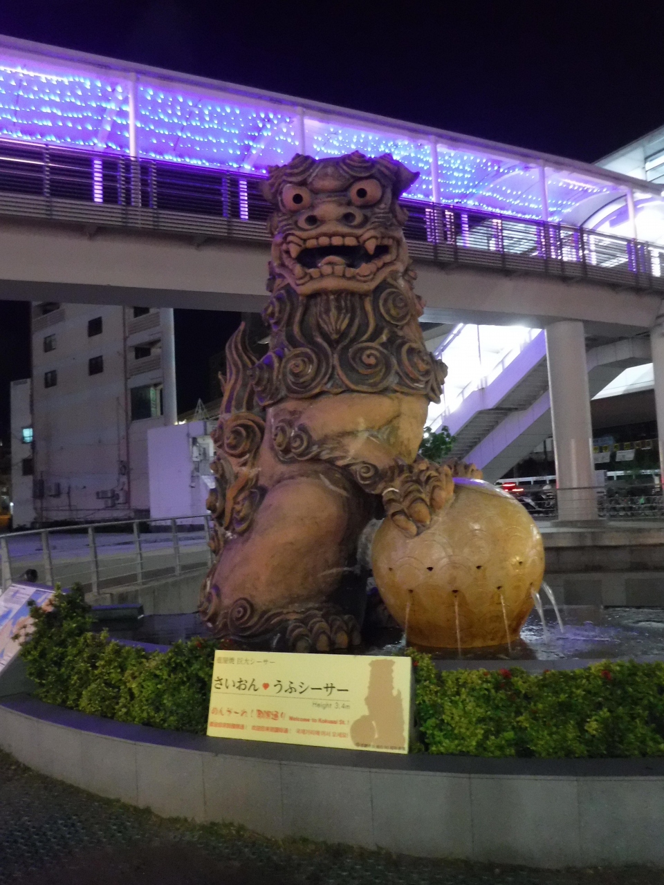 沖縄県那覇市にある観光スポット国際通りにあります。ちょっと端のほうですが、さいおんスクエアという牧志駅にあるショッピングやホテル、公共施設などがある複合施設にあります。大きなシーサーがそびえたっていました。待ち合わせ場所に良いです