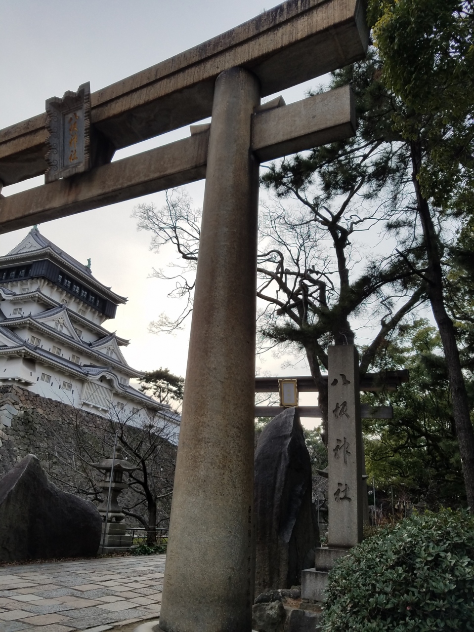 隣にある八坂神社の鳥居越しに見るとカッコ良くおもむきがあります。