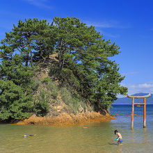 砂浜から少し距離をおいて小さな島があり、干潮時には陸続きとなり歩いて渡れます。