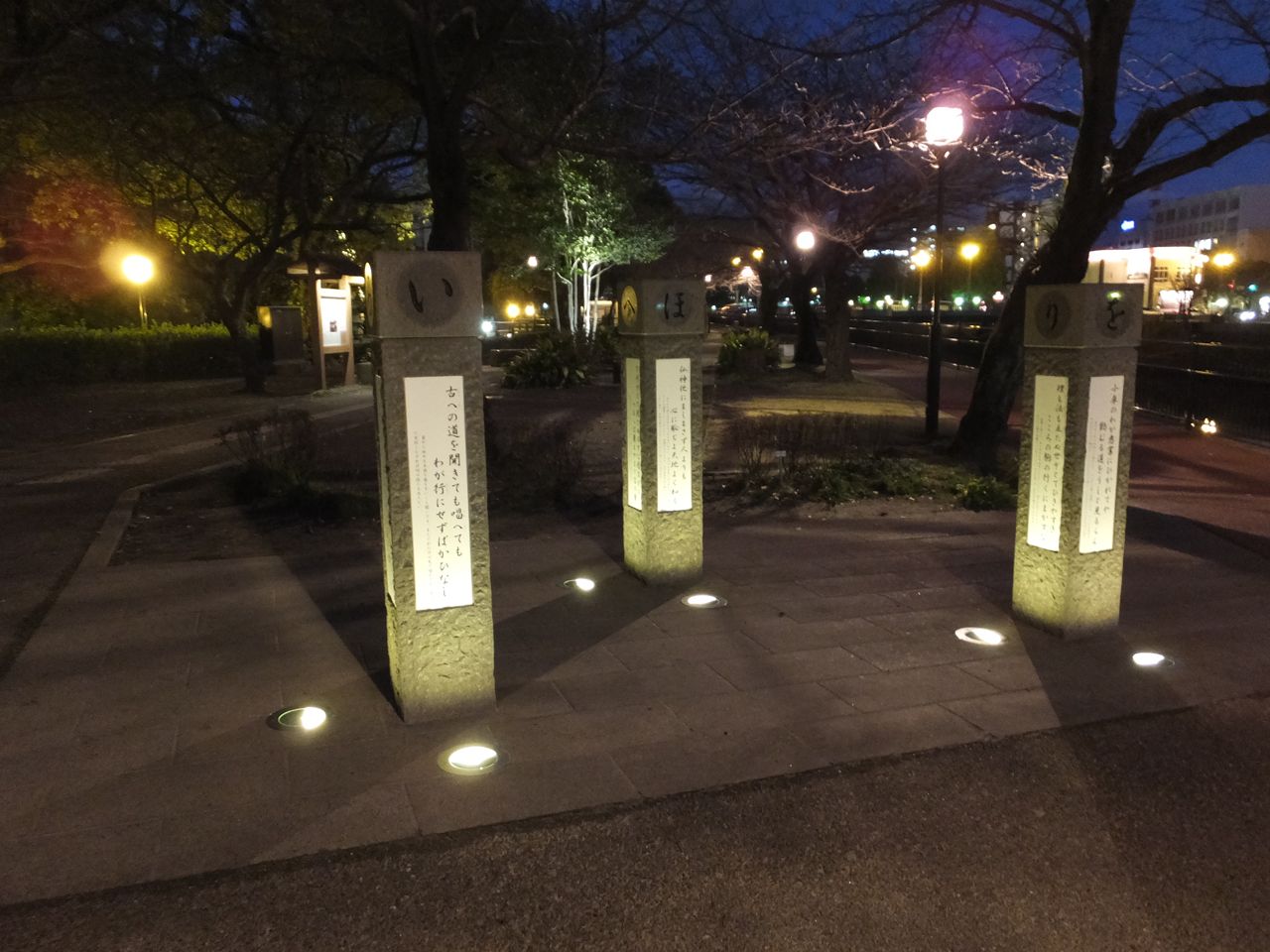 甲突川の左岸、高麗橋の上流に大きな門があって、そこからいろいろ幕末からの歴史を味わえるようなモニュメントや復元家屋などが並んでいます。有料施設かと思わせるような立派な門でしたが普通の散歩道の入口、というだけでした。最初に現れた「いろはうた」の展示がライトが中から照らしていろは歌が書かれたアクリルを照らし、とってもきれい。歴史を考えるかどうかは別にしても、夕刻の散歩道にしてとってもきれいです。