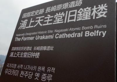 浦上の天主堂に行きました。天主堂自体はきれいにされていて、立派な教会として堂々と建っていました。さて、天主堂から案内板に従って旧鐘楼にいきます。悲しい形で現在も残っていました。石の枠組みも無残な形です。いくまでの道にも昔の壁や像なども残されていました。