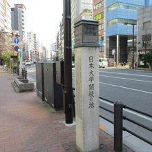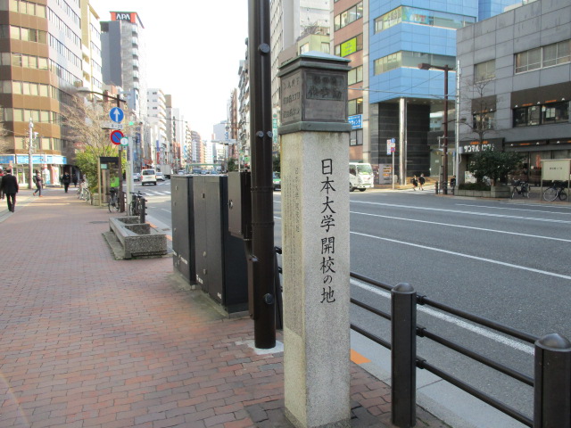 東京メトロ東西線飯田橋駅A5出口から東京区政会館の前の目白通り歩道上に日本大学開校の地の標柱があります。標柱によると明治22年当時の司法大臣・山田顕義によりこの地に国学を研究する皇典講究所が創設されその中の日本法律学校が現在の日本大学の始まりだそうです。現在は大きなオフィスビルとなっていて標柱のみで当時を偲ぶものはなくわざわざ観に行くスポットではありませんが歴史プロムナードを散策するとたくさんの標柱があり歴史に興味深くなり見聞が広がりますのでノンビリ散策することお勧めします。