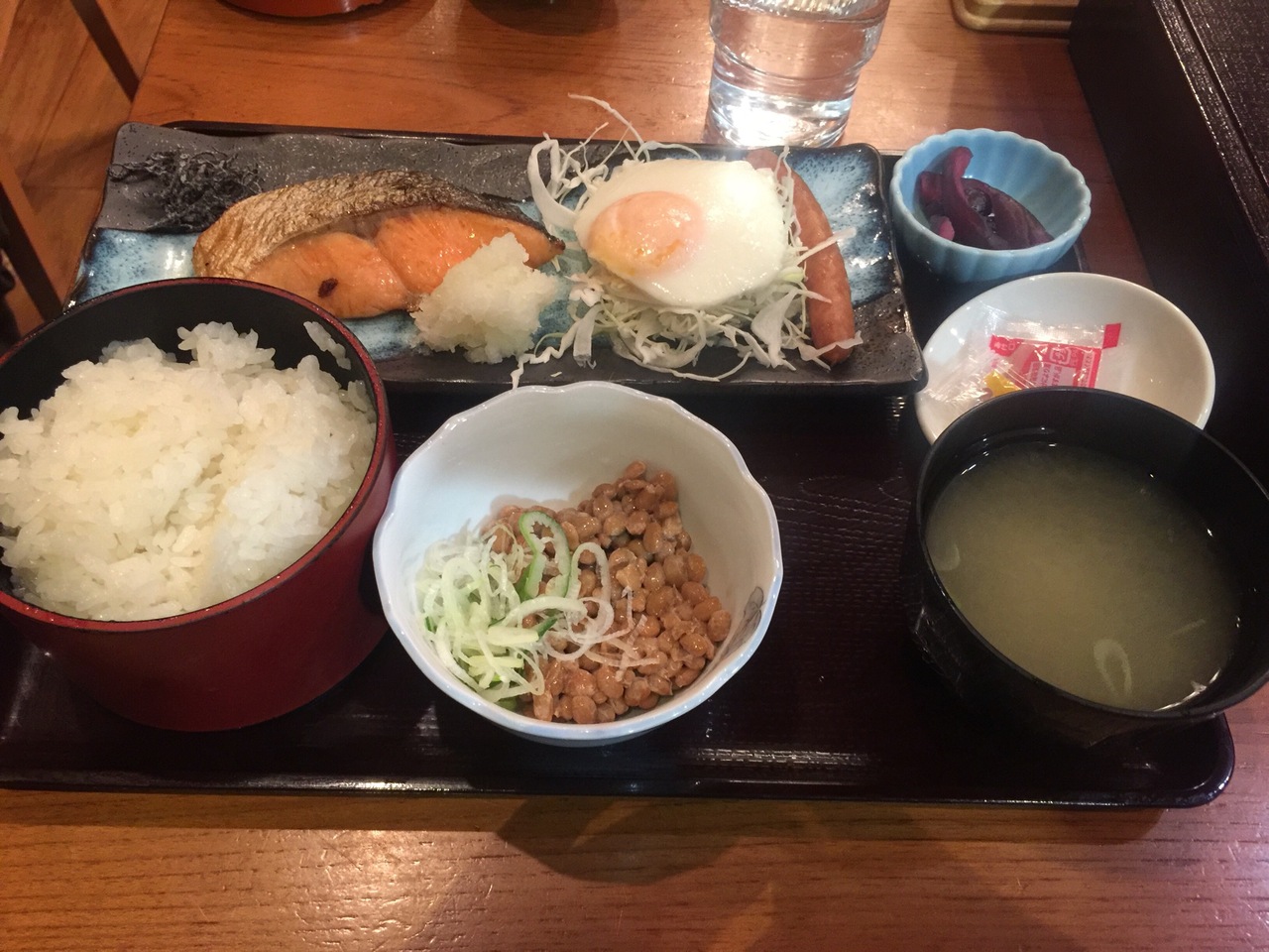 食べたのは朝の和定食850円!キャベツの千切りの上に目玉焼き、鮭焼きに大根おろし、納豆、昆布、漬物にご飯と味噌汁!シンプルです。ご飯はおかわり自由ですよ。